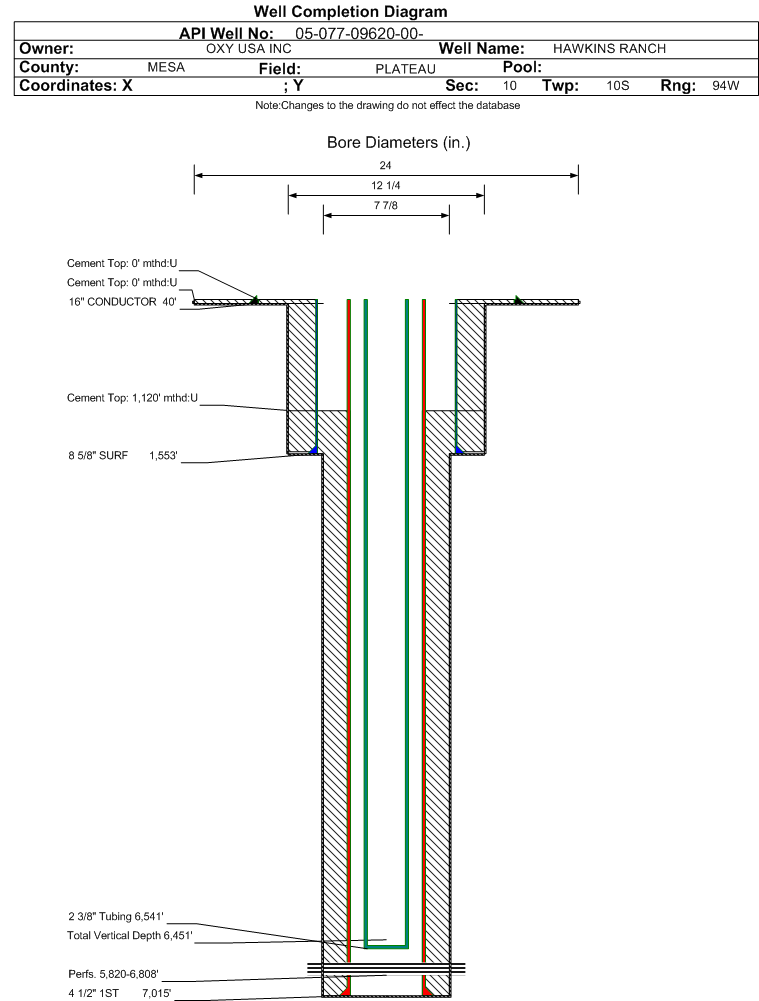 | Wellbore Completed | | Completion Date: | 8/22/2008 | | Spud Date: | 8/10/2008 | Spud Date Is: | ACTUAL | | Measured TD: | 7025 ft. | Measured PB depth: | 6969 ft. | | True Vertical TD: | 6451 ft. | True Vertical PB depth: | 6395 ft. | | Top PZ Location: | Sec:10 Twp: 10S 94W | Footage: 304 FNL 1941 FEL | | Bottom Hole Location: | Sec:10 Twp: 10S 94W | Footage: 304 FNL 1941 FEL | | Log Types: | HIGH RES.IND., SPCTRL DENS.,DUAL SPACED NEUTRON | | Log Types: | CBL | | Casing: | String Type: CONDUCTOR, Hole Size: 24 in., Size: 16 in., Top: 0 ft., Depth: 40 ft., Weight: , Citings Type: ACTUAL | | Cement: | Sacks: , Top: 0 ft., Bottom: 40 ft., Determination Method: | | Casing: | String Type: SURF, Hole Size: 12.25 in., Size: 8.625 in., Top: 0 ft., Depth: 1553 ft., Weight: , Citings Type: ACTUAL | | Cement: | Sacks: 420, Top: 0 ft., Bottom: 1533 ft., Determination Method: | | Casing: | String Type: 1ST, Hole Size: 7.875 in., Size: 4.5 in., Top: 0 ft., Depth: 7015 ft., Weight: , Citings Type: ACTUAL | | Cement: | Sacks: 790, Top: 1120 ft., Bottom: 7015 ft., Determination Method: CBL | | Formation | Interval Top | Log Bottom | Cored | DSTs | | WILLIAMS FORK | 6000 ft. | | N | N | | CAMEO | 6515 ft. | | N | N | | ROLLINS | 6838 ft. | | N | N |
