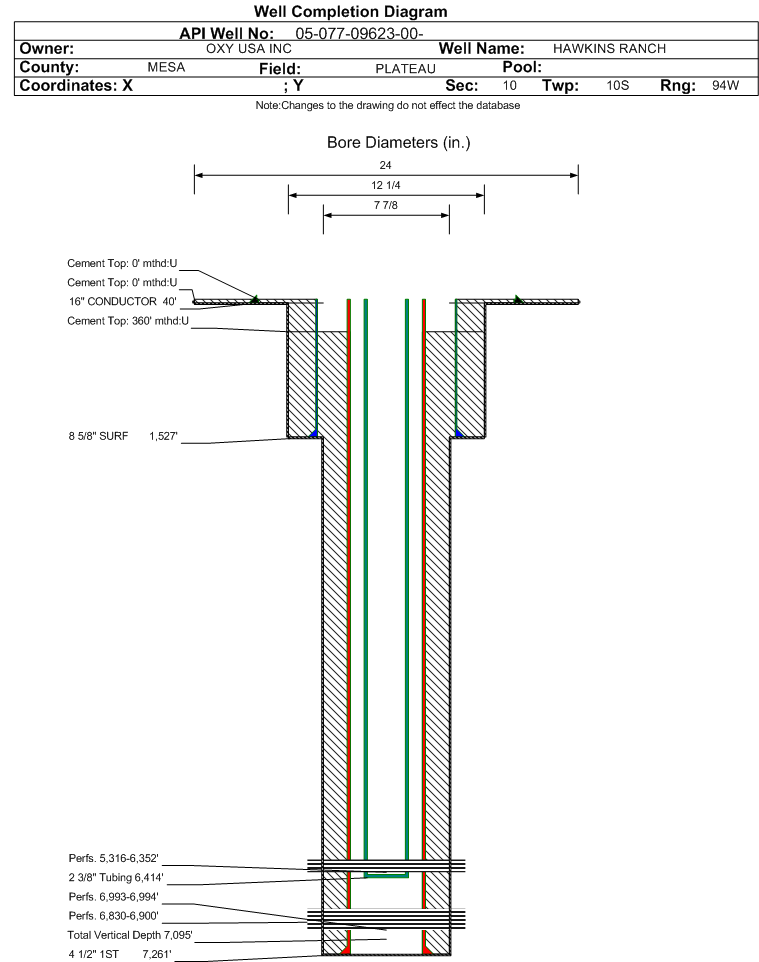 | Wellbore Completed | | Completion Date: | 11/14/2008 | | Spud Date: | 11/3/2008 | Spud Date Is: | ACTUAL | | Measured TD: | 7261 ft. | Measured PB depth: | 7205 ft. | | True Vertical TD: | 7095 ft. | True Vertical PB depth: | 7039 ft. | | Top PZ Location: | Sec:10 Twp: 10S 94W | Footage: 1020 FNL 1992 FEL | | Bottom Hole Location: | Sec:10 Twp: 10S 94W | Footage: 1020 FNL 1992 FEL | | Log Types: | ACOUSTIC CBL | | Casing: | String Type: CONDUCTOR, Hole Size: 24 in., Size: 16 in., Top: 0 ft., Depth: 40 ft., Weight: , Citings Type: ACTUAL | | Cement: | Sacks: , Top: 0 ft., Bottom: 40 ft., Determination Method: | | Casing: | String Type: SURF, Hole Size: 12.25 in., Size: 8.625 in., Top: 0 ft., Depth: 1527 ft., Weight: , Citings Type: ACTUAL | | Cement: | Sacks: 420, Top: 0 ft., Bottom: 1527 ft., Determination Method: | | Casing: | String Type: 1ST, Hole Size: 7.875 in., Size: 4.5 in., Top: 0 ft., Depth: 7261 ft., Weight: , Citings Type: ACTUAL | | Cement: | Sacks: 974, Top: 360 ft., Bottom: 7260 ft., Determination Method: CBL | | Formation | Interval Top | Log Bottom | Cored | DSTs | | WILLIAMS FORK | 3765 ft. | | N | N | | CAMEO | 5997 ft. | | N | N | | ROLLINS | 6387 ft. | | N | N | | COZZETTE | 6793 ft. | | N | N | | CORCORAN | 6979 ft. | | N | N |