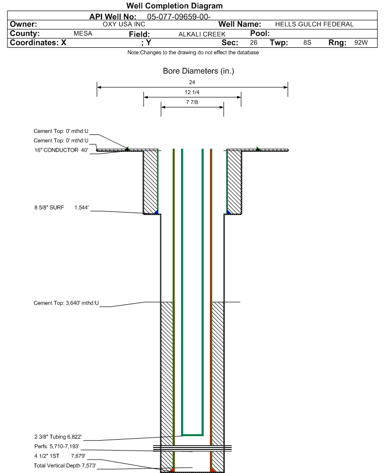 | Wellbore Completed | | Completion Date: | 7/27/2008 | | Spud Date: | 7/13/2008 | Spud Date Is: | ACTUAL | | Measured TD: | 7681 ft. | Measured PB depth: | 7629 ft. | | True Vertical TD: | 7573 ft. | True Vertical PB depth: | 7520 ft. | | Top PZ Location: | Sec:23 Twp: 8S 92W | Footage: 995 FSL 647 FWL | | Bottom Hole Location: | Sec:23 Twp: 8S 92W | Footage: 995 FSL 647 FWL | | Log Types: | OPEN HOLE TRPL COMBO, HRI W/SP,GR,CALIBER, SPECTRAL DENSITY/ DUAL SPACED NEUTRON, CBL | | Casing: | String Type: CONDUCTOR, Hole Size: 24 in., Size: 16 in., Top: 0 ft., Depth: 40 ft., Weight: , Citings Type: ACTUAL | | Cement: | Sacks: , Top: 0 ft., Bottom: 40 ft., Determination Method: | | Casing: | String Type: SURF, Hole Size: 12.25 in., Size: 8.625 in., Top: 0 ft., Depth: 1544 ft., Weight: , Citings Type: ACTUAL | | Cement: | Sacks: 420, Top: 0 ft., Bottom: 1545 ft., Determination Method: CALC | | Casing: | String Type: 1ST, Hole Size: 7.875 in., Size: 4.5 in., Top: 0 ft., Depth: 7679 ft., Weight: , Citings Type: ACTUAL | | Cement: | Sacks: 1200, Top: 3640 ft., Bottom: 7681 ft., Determination Method: CBL | | Formation | Interval Top | Log Bottom | Cored | DSTs | | WILLIAMS FORK | 5701 ft. | 6769 ft. | N | N | | CAMEO | 6769 ft. | 7502 ft. | N | N | | ROLLINS | 7502 ft. | | N | N |