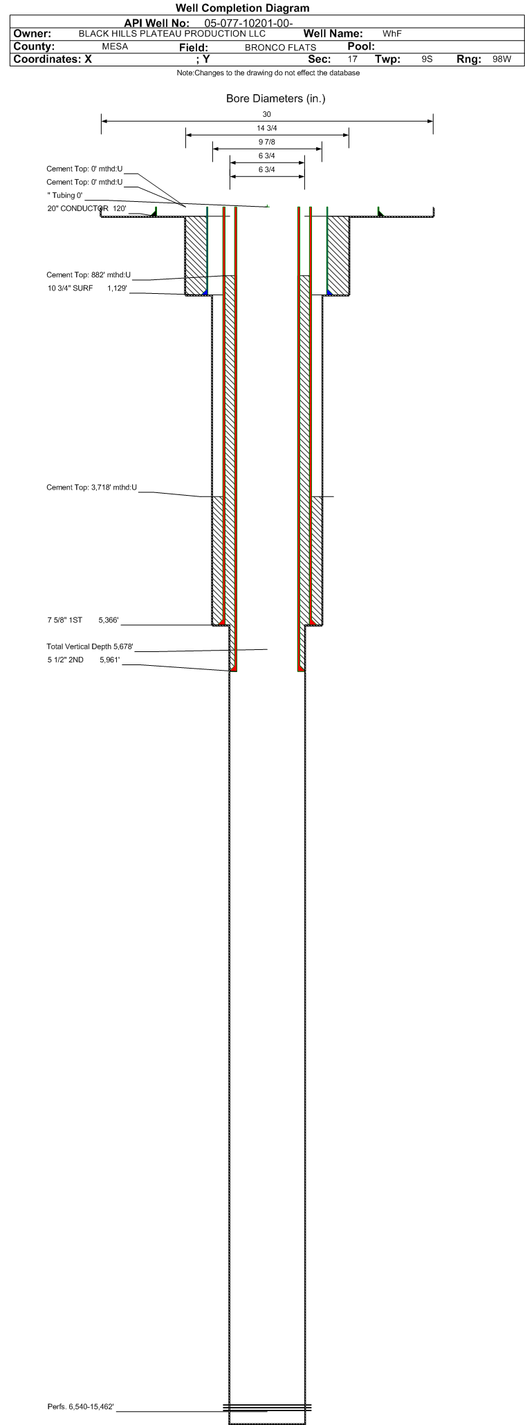 Wellbore #00 Wellbore Classification: GW Status: PR - 10/19/2020 Measured TD: 15621 ft. Vertical TD: 5678 ft.| Wellbore Data for Original Wellbore | Wellbore Classification: GW PR - 10/19/2020 | | Wellbore Permit | HORIZONTAL | | Permit #: | | Expiration Date: | 8/9/2016 | | Proposed Top PZ Location: | Sec:17 Twp: 9S 98W | Footage: 689 FNL 680 FWL | | Bottom Hole Location: | Sec:20 Twp: 9S 98W | Footage: 1 FSL 685 FWL | | Proposed Depth/Form: | 16418 ft. | | Surface Mineral Owner Same: | No | | Mineral Owner: | FEDERAL | Surface Owner: | FEDERAL | | Unit: | Whittaker Flats | Unit Number: | COC075609X | | Formation And Spacing: | Code: MNCS , Formation: MANCOS , Order: , Unit Acreage: , Drill Unit: | | Casing: | String Type: CONDUCTOR, Hole Size: 30 in., Size: 20 in., Top: 0 ft., Depth: 120 ft., Weight: Line , Citings Type: PLANNED | | Cement: | Sacks: 319, Top: 0 ft., Bottom: 120 ft. | | Casing: | String Type: SURF, Hole Size: 14.75 in., Size: 10.75 in., Top: 0 ft., Depth: 1000 ft., Weight: 41 , Citings Type: PLANNED | | Cement: | Sacks: 469, Top: 0 ft., Bottom: 1000 ft. | | Casing: | String Type: 1ST, Hole Size: 9.875 in., Size: 7.625 in., Top: 0 ft., Depth: 5524 ft., Weight: 26 , Citings Type: PLANNED | | Cement: | Sacks: 360, Top: 3740 ft., Bottom: 5524 ft. | | Casing: | String Type: 2ND, Hole Size: 6.75 in., Size: 4.5 in., Top: 0 ft., Depth: 16418 ft., Weight: 12 , Citings Type: PLANNED | | Cement: | Sacks: 1021, Top: 200 ft., Bottom: 16418 ft. | | Casing: | String Type: STAGE TOOL, Hole Size: , Size: , Top: , Depth: 3740 ft., Weight: , Citings Type: PLANNED | | Cement: | Sacks: 585, Top: 800 ft., Bottom: 3740 ft. |
