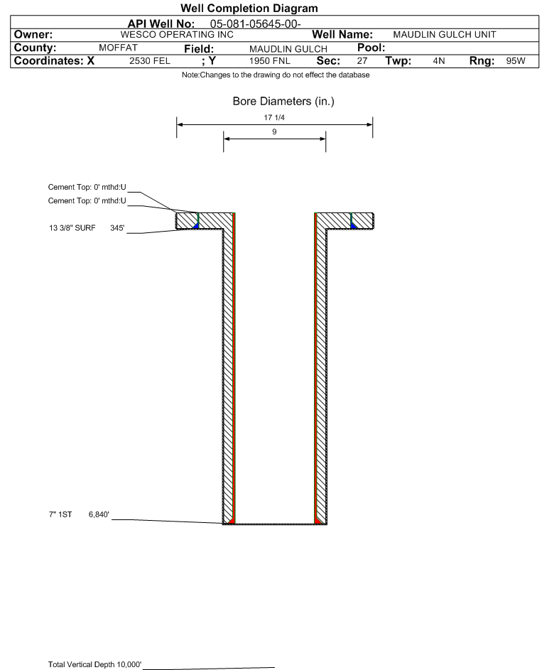 | Wellbore Completed | | Completion Date: | 11/12/1966 | | Spud Date: | 10/22/1966 | Spud Date Is: | ACTUAL | | Measured TD: | 6250 ft. | Measured PB depth: | 6250 ft. | | True Vertical TD: | 0 ft. | True Vertical PB depth: | | | Casing: | String Type: SURF, Hole Size: 17.25 in., Size: 13.375 in., Top: , Depth: 357 ft., Weight: 48 , Citings Type: ACTUAL | | Cement: | Sacks: 325, Top: , Bottom: 357 ft., Determination Method: VISU | | Casing: | String Type: 1ST, Hole Size: , Size: , Top: , Depth: 6840 ft., Weight: 23 , Citings Type: ACTUAL | | Cement: | Sacks: 300, Top: 5300 ft., Bottom: 6840 ft., Determination Method: CBL | | Casing: | String Type: 1ST LINER, Hole Size: 6.359 in., Size: 5.5 in., Top: , Depth: 5983 ft., Weight: 17 , Citings Type: ACTUAL | | Cement: | Sacks: 310, Top: 120 ft., Bottom: 5983 ft., Determination Method: CALC | | Formation | Interval Top | Log Bottom | Cored | DSTs | | FRONTIER | 5788 ft. | | | | | DAKOTA | 6144 ft. | | | | | MORRISON | 6232 ft. | | | |