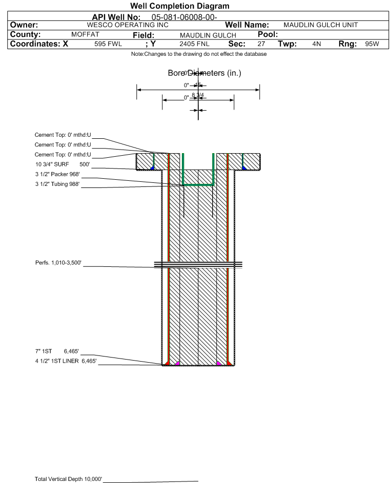 | Wellbore Completed | | Completion Date: | 5/7/1967 | | Spud Date: | 4/3/1967 | Spud Date Is: | ACTUAL | | Measured TD: | 6783 ft. | Measured PB depth: | 3595 ft. | | True Vertical TD: | | True Vertical PB depth: | | | Log Types: | | | Casing: | String Type: SURF, Hole Size: , Size: 10.75 in., Top: 0 ft., Depth: 490 ft., Weight: 40.5 , Citings Type: ACTUAL | | Cement: | Sacks: 240, Top: , Bottom: 490 ft., Determination Method: VISU | | Casing: | String Type: 1ST, Hole Size: 8.75 in., Size: , Top: 0 ft., Depth: 6465 ft., Weight: 20,23,26 , Citings Type: ACTUAL | | Cement: | Sacks: 475, Top: 4400 ft., Bottom: 6465 ft., Determination Method: CALC | | Casing: | String Type: 2ND, Hole Size: , Size: 5.5 in., Top: 0 ft., Depth: 998 ft., Weight: 15.5 , Citings Type: ACTUAL | | Cement: | Sacks: 100, Top: , Bottom: 998 ft., Determination Method: CBL | | Casing: | String Type: 1ST LINER, Hole Size: , Size: 4.5 in., Top: 6340 ft., Depth: 6783 ft., Weight: 11.6 , Citings Type: ACTUAL | | Cement: | Sacks: , Top: , Bottom: , Determination Method: | | Additional Cement: | String Type: 1ST , Top: 1214 ft., Depth: 1200 ft., Bottom: 1200 ft., Sacks: 1000, Method: PERF & PUMP | | Additional Cement: | String Type: 1ST , Top: 0 ft., Depth: 0 ft., Bottom: 1200 ft., Sacks: 300, Method: SQUEEZE | | Additional Cement: | String Type: 1ST , Top: 4400 ft., Depth: 5866 ft., Bottom: 5870 ft., Sacks: 250, Method: SQUEEZE | | Additional Cement: | String Type: 1ST , Top: 4400 ft., Depth: 5824 ft., Bottom: 5830 ft., Sacks: 200, Method: SQUEEZE | | Additional Cement: | String Type: 1ST , Top: 4400 ft., Depth: 5756 ft., Bottom: 5811 ft., Sacks: 200, Method: SQUEEZE | | Formation | Interval Top | Log Bottom | Cored | DSTs | | MORAPOS | 1020 ft. | 1090 ft. | | | | MANCOS | 1500 ft. | 3500 ft. | | | | FRONTIER | 5394 ft. | 5668 ft. | | | | MOWRY | 5668 ft. | 5746 ft. | | | | DAKOTA | 5746 ft. | 5803 ft. | Y | | | MORRISON | 5891 ft. | 6385 ft. | | |