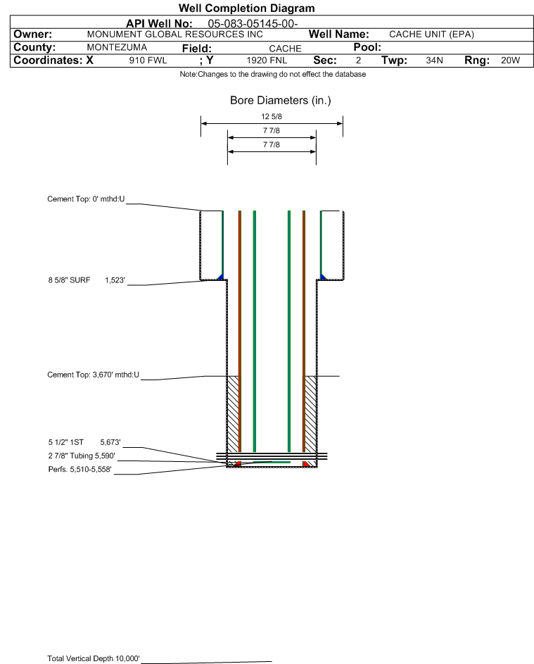 | Wellbore Completed | | Completion Date: | 1/28/1970 | | Spud Date: | 5/11/1965 | Spud Date Is: | ACTUAL | | Measured TD: | 5673 ft. | Measured PB depth: | 5625 ft. | | True Vertical TD: | | True Vertical PB depth: | | | Log Types: | INDUCTION ELECTRIC, GAMMA RAY SONIC-CALIPER | | Casing: | String Type: SURF, Hole Size: , Size: 8.625 in., Top: , Depth: 1523 ft., Weight: 24 , Citings Type: ACTUAL | | Cement: | Sacks: 500, Top: 0 ft., Bottom: 1523 ft., Determination Method: VISU | | Casing: | String Type: 1ST, Hole Size: 7.875 in., Size: 5.5 in., Top: , Depth: 5673 ft., Weight: 14.5 , Citings Type: ACTUAL | | Cement: | Sacks: 300, Top: 3670 ft., Bottom: 5673 ft., Determination Method: CBL | | Casing: | String Type: STAGE TOOL, Hole Size: 7.875 in., Size: 5.5 in., Top: , Depth: 3182 ft., Weight: , Citings Type: ACTUAL | | Cement: | Sacks: 400, Top: 1170 ft., Bottom: 3182 ft., Determination Method: CBL | | Formation | Interval Top | Log Bottom | Cored | DSTs | | CUTLER | 2742 ft. | | | | | HERMOSA | 4535 ft. | | | | | ISMAY | 5448 ft. | | | | | LOWER ISMAY | 5574 ft. | | | |