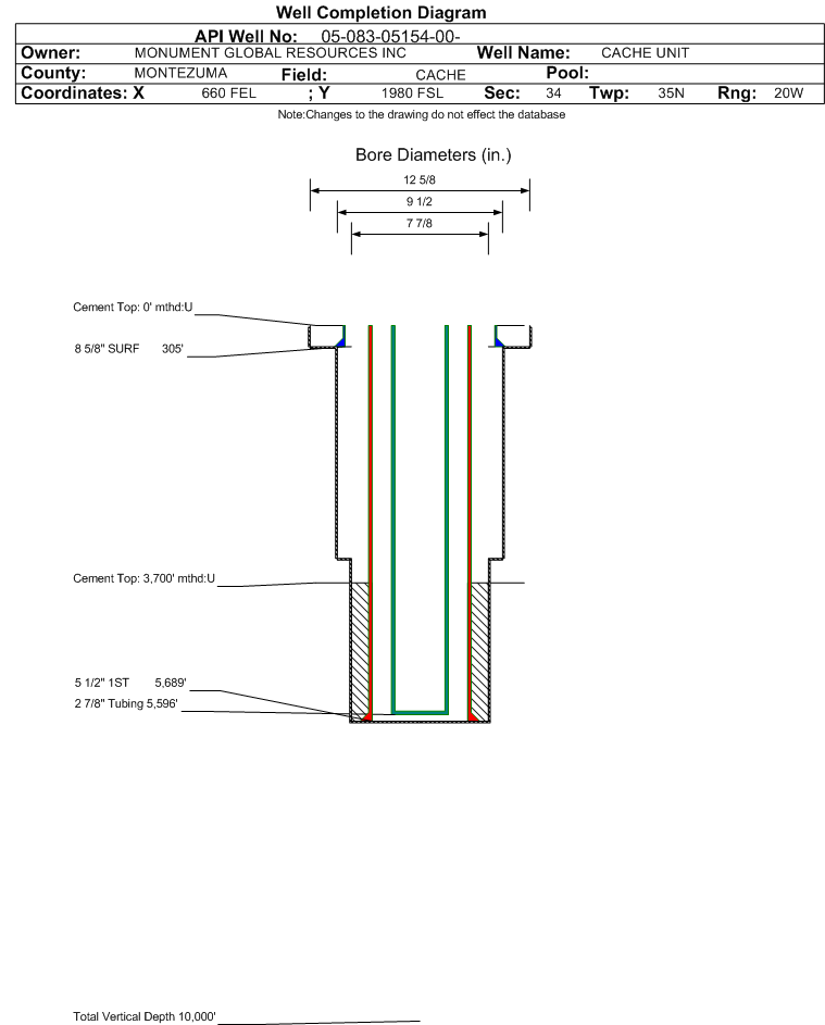 | Wellbore Completed | | Completion Date: | 1/25/1984 | | Spud Date: | 6/2/1965 | Spud Date Is: | ACTUAL | | Measured TD: | 5710 ft. | Measured PB depth: | 5664 ft. | | True Vertical TD: | | True Vertical PB depth: | | | Log Types: | INDUCTION ELECTRIC & SONIC GAMMA RAY WITH CALIPER | | Casing: | String Type: SURF, Hole Size: 11 in., Size: 8.625 in., Top: , Depth: 305 ft., Weight: 24 , Citings Type: ACTUAL | | Cement: | Sacks: 265, Top: 0 ft., Bottom: 305 ft., Determination Method: CALC | | Casing: | String Type: 1ST, Hole Size: 7.875 in., Size: 5.5 in., Top: , Depth: 5689 ft., Weight: 14 , Citings Type: ACTUAL | | Cement: | Sacks: 300, Top: 3700 ft., Bottom: 5689 ft., Determination Method: CALC | | Casing: | String Type: STAGE TOOL, Hole Size: 7.875 in., Size: 5.5 in., Top: , Depth: 3349 ft., Weight: 14 , Citings Type: ACTUAL | | Cement: | Sacks: 650, Top: 0 ft., Bottom: 3349 ft., Determination Method: CALC | | Formation | Interval Top | Log Bottom | Cored | DSTs | | CUTLER | 2692 ft. | | N | N | | HERMOSA | 4520 ft. | | N | N | | ISMAY | 5430 ft. | | N | N | | LOWER ISMAY | 5585 ft. | | N | N |