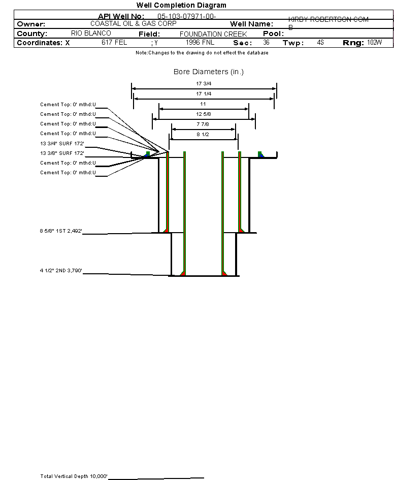| Wellbore Completed | | Completion Date: | 7/17/1977 | | Measured TD: | 6480 ft. | Measured PB depth: | 4300 ft. | | True Vertical TD: | 0 ft. | True Vertical PB depth: | | | Casing: | String Type: SURF, Hole Size: , Size: 13.75 in., Top: , Depth: 172 ft., Weight: , Citings Type: ACTUAL | | Cement: | Sacks: , Top: , Bottom: , Determination Method: | | Casing: | String Type: SURF, Hole Size: 17.25 in., Size: 13.375 in., Top: 0 ft., Depth: 172 ft., Weight: , Citings Type: HISTORICAL | | Cement: | Sacks: 100, Top: 0 ft., Bottom: , Determination Method: | | Casing: | String Type: 1ST, Hole Size: , Size: 8.625 in., Top: , Depth: 2492 ft., Weight: , Citings Type: ACTUAL | | Cement: | Sacks: , Top: , Bottom: , Determination Method: | | Casing: | String Type: 1ST, Hole Size: 11 in., Size: 8.625 in., Top: 0 ft., Depth: 2492 ft., Weight: , Citings Type: HISTORICAL | | Cement: | Sacks: 0, Top: 0 ft., Bottom: , Determination Method: | | Casing: | String Type: 2ND, Hole Size: , Size: 4.5 in., Top: , Depth: 3790 ft., Weight: , Citings Type: ACTUAL | | Cement: | Sacks: , Top: , Bottom: , Determination Method: | | Casing: | String Type: 2ND, Hole Size: 7.875 in., Size: 4.5 in., Top: 0 ft., Depth: 3790 ft., Weight: , Citings Type: HISTORICAL | | Cement: | Sacks: 0, Top: 0 ft., Bottom: , Determination Method: | | Formation | Interval Top | Log Bottom | Cored | DSTs | | MESAVERDE | 490 ft. | | | | | MANCOS | 1714 ft. | | | | | SEGO | 1847 ft. | | | | | CASTLEGATE | 2180 ft. | | | | | MANCOS A | 2700 ft. | | | | | MANCOS B | 3262 ft. | | | |