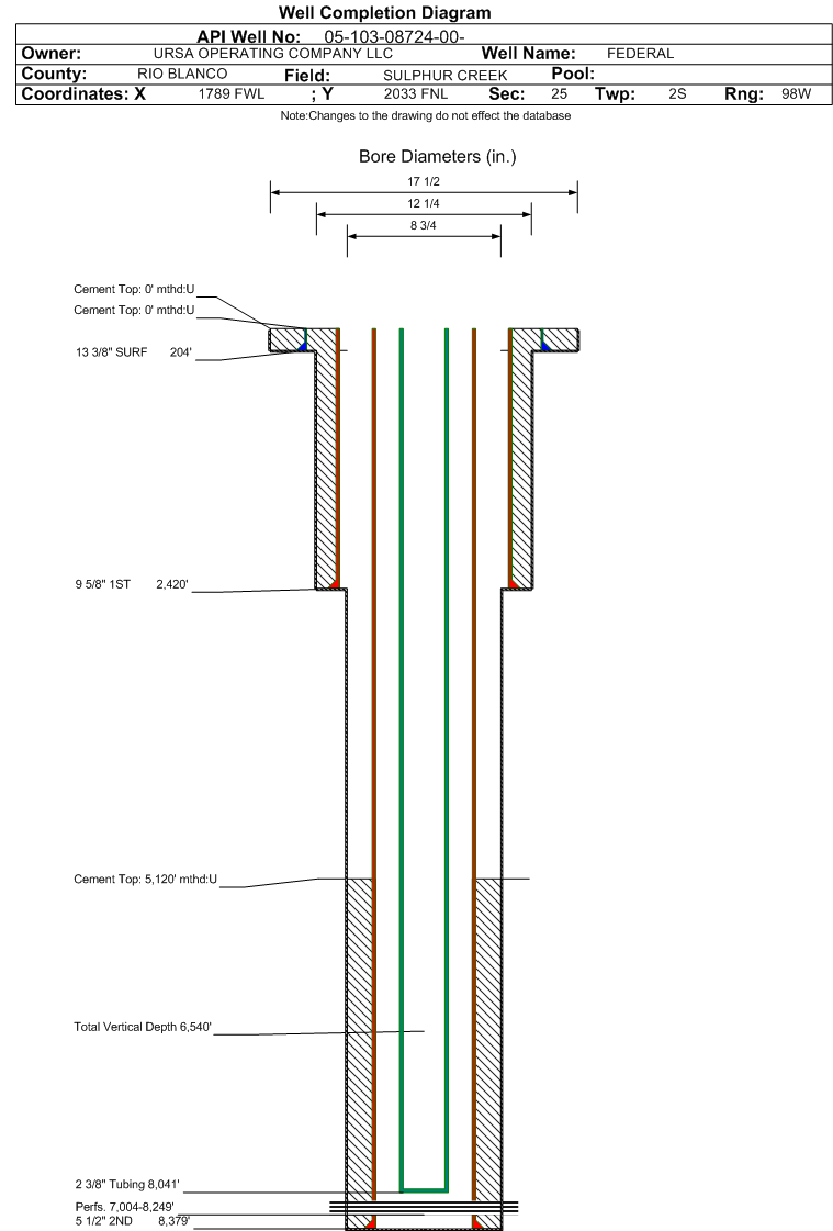 | Wellbore Completed | | Completion Date: | 5/8/1981 | | Spud Date: | 3/28/1981 | Spud Date Is: | ACTUAL | | Measured TD: | 8379 ft. | Measured PB depth: | 8313 ft. | | True Vertical TD: | | True Vertical PB depth: | | | Log Types: | | | Casing: | String Type: SURF, Hole Size: 17.5 in., Size: 13.375 in., Top: 0 ft., Depth: 204 ft., Weight: 54.5 , Citings Type: ACTUAL | | Cement: | Sacks: 255, Top: 0 ft., Bottom: 205 ft., Determination Method: VISU | | Casing: | String Type: 1ST, Hole Size: 12.25 in., Size: 9.625 in., Top: 0 ft., Depth: 2420 ft., Weight: 36 , Citings Type: ACTUAL | | Cement: | Sacks: 700, Top: 0 ft., Bottom: 2420 ft., Determination Method: VISU | | Casing: | String Type: 2ND, Hole Size: 8.75 in., Size: 5.5 in., Top: 0 ft., Depth: 8379 ft., Weight: 17 , Citings Type: ACTUAL | | Cement: | Sacks: 1200, Top: 5120 ft., Bottom: 8379 ft., Determination Method: CBL | | Additional Cement: | String Type: 1ST , Top: 5076 ft., Depth: 5026 ft., Bottom: 5107 ft., Sacks: 25, Method: SQUEEZE | | Additional Cement: | String Type: 1ST , Top: 3721 ft., Depth: 3671 ft., Bottom: 3997 ft., Sacks: 177, Method: SQUEEZE | | Additional Cement: | String Type: 1ST , Top: 3198 ft., Depth: 3148 ft., Bottom: 3232 ft., Sacks: 50, Method: SQUEEZE | | Formation | Interval Top | Log Bottom | Cored | DSTs | | WASATCH A | 2818 ft. | | N | N | | WASATCH G | 4017 ft. | | N | N | | MESAVERDE | 5780 ft. | | | | | OHIO CREEK | 5786 ft. | | N | N | | WILLIAMS FORK | 5963 ft. | | N | N |