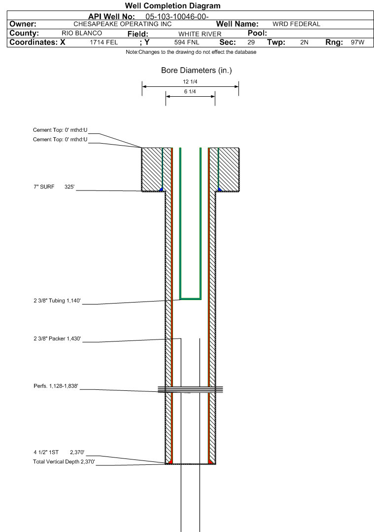 | Wellbore Completed | | Completion Date: | 12/16/2000 | | Spud Date: | 10/19/2000 | Spud Date Is: | ACTUAL | | Measured TD: | 2370 ft. | Measured PB depth: | 1450 ft. | | True Vertical TD: | 2370 ft. | True Vertical PB depth: | 1450 ft. | | Log Types: | GR/CBL, THERMAL MULTIGATE DECAY LITHOLOGY (CASED HOLE) | | Casing: | String Type: SURF, Hole Size: 12.25 in., Size: 7 in., Top: , Depth: 325 ft., Weight: 20 , Citings Type: ACTUAL | | Cement: | Sacks: 0, Top: 0 ft., Bottom: 325 ft., Determination Method: CALC | | Casing: | String Type: 1ST, Hole Size: 6.25 in., Size: 4.5 in., Top: 0 ft., Depth: 2370 ft., Weight: 9.5 , Citings Type: ACTUAL | | Cement: | Sacks: 0, Top: 0 ft., Bottom: , Determination Method: CALC | | Formation | Interval Top | Log Bottom | Cored | DSTs | | WASATCH | 1128 ft. | 1838 ft. | N | N |