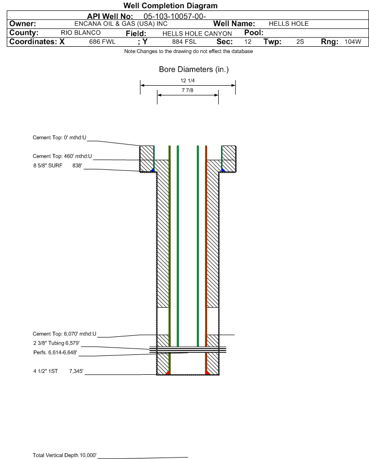 | Wellbore Completed | | Completion Date: | 4/25/2003 | | Spud Date: | 2/11/2003 | Spud Date Is: | ACTUAL | | Measured TD: | 7350 ft. | Measured PB depth: | 7295 ft. | | True Vertical TD: | | True Vertical PB depth: | | | Log Types: | ARRAY IND-GR, GR-SPECTROMETRY, COMP NEUT-LITHO DENSITY, CBL | | Casing: | String Type: SURF, Hole Size: 12.25 in., Size: 8.625 in., Top: 0 ft., Depth: 838 ft., Weight: 32 , Citings Type: ACTUAL | | Cement: | Sacks: 480, Top: 0 ft., Bottom: 850 ft., Determination Method: CALC | | Casing: | String Type: 1ST, Hole Size: 7.875 in., Size: 4.5 in., Top: 0 ft., Depth: 7345 ft., Weight: 11.6 , Citings Type: ACTUAL | | Cement: | Sacks: 310, Top: 6070 ft., Bottom: 7345 ft., Determination Method: CBL | | Casing: | String Type: S.C. 1.1, Hole Size: , Size: , Top: , Depth: 4363 ft., Weight: , Citings Type: ACTUAL | | Cement: | Sacks: 1075, Top: 460 ft., Bottom: 5190 ft., Determination Method: CBL | | Formation | Interval Top | Log Bottom | Cored | DSTs | | MANCOS B | 0 ft. | 3917 ft. | N | N | | SEGO | 1981 ft. | | N | N | | LOYD SS | 2198 ft. | | N | N | | MANCOS A | 2489 ft. | 3356 ft. | N | N | | FRONTIER | 6373 ft. | | N | N | | DAKOTA | 6605 ft. | | N | N | | MORRISON | 6856 ft. | | N | N |
