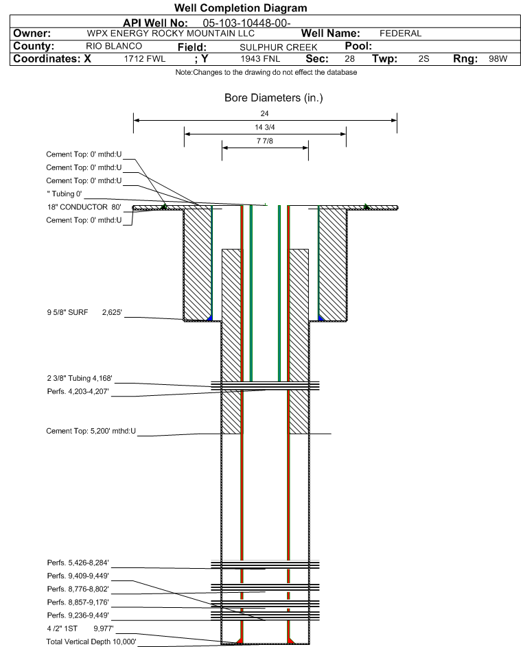 Wellbore #00 Wellbore Classification: GW Status: PR - 5/1/2025 Measured TD: 9990 ft.| Wellbore Data for Original Wellbore | Wellbore Classification: GW PR - 5/1/2025 | | Wellbore Permit | | | Permit #: | 20075726 | Expiration Date: | 10/9/2008 | | Proposed Depth/Form: | 9990 ft. | | Surface Mineral Owner Same: | Yes | | Mineral Owner: | FEDERAL | Surface Owner: | FEDERAL | | Unit: | | Unit Number: | | | Formation And Spacing: | Code: CMSMV , Formation: CAMEO SANDS-MESAVERDE , Order: , Unit Acreage: 160, Drill Unit: | | Formation And Spacing: | Code: FTUN , Formation: FORT UNION , Order: , Unit Acreage: , Drill Unit: | | Formation And Spacing: | Code: SEGO , Formation: SEGO , Order: , Unit Acreage: , Drill Unit: | | Casing: | String Type: CONDUCTOR, Hole Size: 24 in., Size: 18 in., Top: , Depth: 45 ft., Weight: 48 , Citings Type: PLANNED | | Cement: | Sacks: , Top: 0 ft., Bottom: 45 ft. | | Casing: | String Type: SURF, Hole Size: 13.5 in., Size: 9.625 in., Top: , Depth: 2078 ft., Weight: 32.3 , Citings Type: PLANNED | | Cement: | Sacks: , Top: 0 ft., Bottom: 2078 ft. | | Casing: | String Type: 1ST, Hole Size: 7.875 in., Size: 4.5 in., Top: , Depth: 9977 ft., Weight: 11.6 , Citings Type: PLANNED | | Cement: | Sacks: 1160, Top: 5420 ft., Bottom: 9977 ft. |