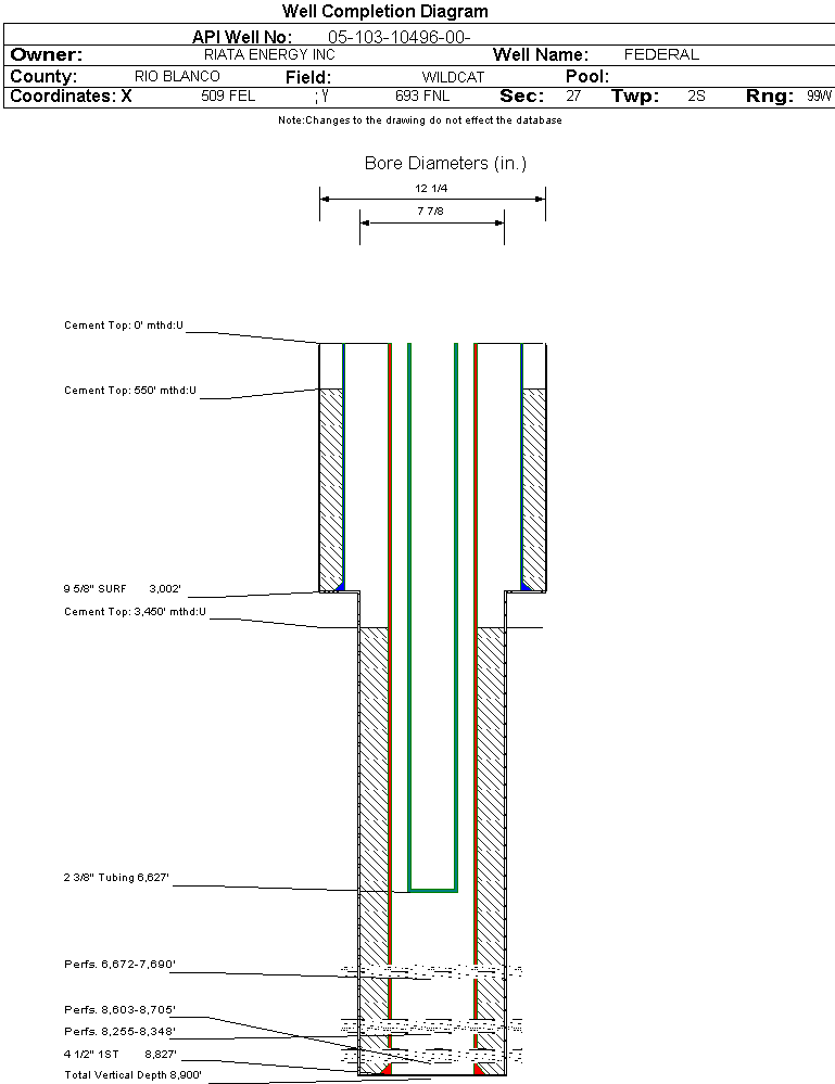 Wellbore #00 Wellbore Classification: GW Status: SI - 11/1/2025 Measured TD: 8900 ft. Vertical TD: 8900 ft.| Wellbore Data for Original Wellbore | Wellbore Classification: GW SI - 11/1/2025 | | Wellbore Permit | | | Permit #: | 20064300 | Expiration Date: | 8/24/2007 | | Proposed Depth/Form: | 9000 ft. | | Surface Mineral Owner Same: | Yes | | Mineral Owner: | FEDERAL | Surface Owner: | FEDERAL | | Unit: | | Unit Number: | | | Formation And Spacing: | Code: ILES , Formation: ILES , Order: , Unit Acreage: , Drill Unit: | | Formation And Spacing: | Code: MVRD , Formation: MESAVERDE , Order: , Unit Acreage: , Drill Unit: | | Formation And Spacing: | Code: SEGO , Formation: SEGO , Order: , Unit Acreage: , Drill Unit: | | Casing: | String Type: SURF, Hole Size: 12.25 in., Size: 9.625 in., Top: , Depth: 3002 ft., Weight: 36 , Citings Type: PLANNED | | Cement: | Sacks: 692, Top: 0 ft., Bottom: 3002 ft. | | Casing: | String Type: 1ST, Hole Size: 7.875 in., Size: 4.5 in., Top: , Depth: 8827 ft., Weight: 11.6 , Citings Type: PLANNED | | Cement: | Sacks: 939, Top: 3450 ft., Bottom: 8827 ft. |
