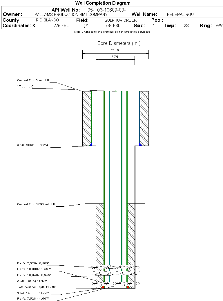 | Wellbore Completed | | Completion Date: | 6/23/2006 | | Spud Date: | 5/15/2006 | Spud Date Is: | ACTUAL | | Measured TD: | 11725 ft. | Measured PB depth: | 11630 ft. | | True Vertical TD: | 11719 ft. | True Vertical PB depth: | | | Top PZ Location: | Sec:1 Twp: 2S 98W | Footage: 669 FSL 760 FEL | | Bottom Hole Location: | Sec:1 Twp: 2S 98W | Footage: 669 FSL 760 FEL | | Log Types: | CBL; HIGH RESOLUTION INDUCTION/SPECTRAL DENSITY/DUAL SPACED NEUTRON | | Casing: | String Type: SURF, Hole Size: 13.5 in., Size: 9.625 in., Top: 0 ft., Depth: 3224 ft., Weight: , Citings Type: ACTUAL | | Cement: | Sacks: 1712, Top: 0 ft., Bottom: 3224 ft., Determination Method: | | Casing: | String Type: 1ST, Hole Size: 7.875 in., Size: 4.5 in., Top: 0 ft., Depth: 11707 ft., Weight: , Citings Type: ACTUAL | | Cement: | Sacks: 2450, Top: 6690 ft., Bottom: 11707 ft., Determination Method: CBL | | Formation | Interval Top | Log Bottom | Cored | DSTs | | WASATCH G | 4950 ft. | | N | N | | FORT UNION | 5270 ft. | | N | N | | MESAVERDE | 6996 ft. | | N | N | | CAMEO | 10142 ft. | | N | N | | ROLLINS | 10591 ft. | | N | N | | COZZETTE | 10739 ft. | | N | N | | CORCORAN | 10948 ft. | | N | N | | SEGO | 11306 ft. | | N | N |
