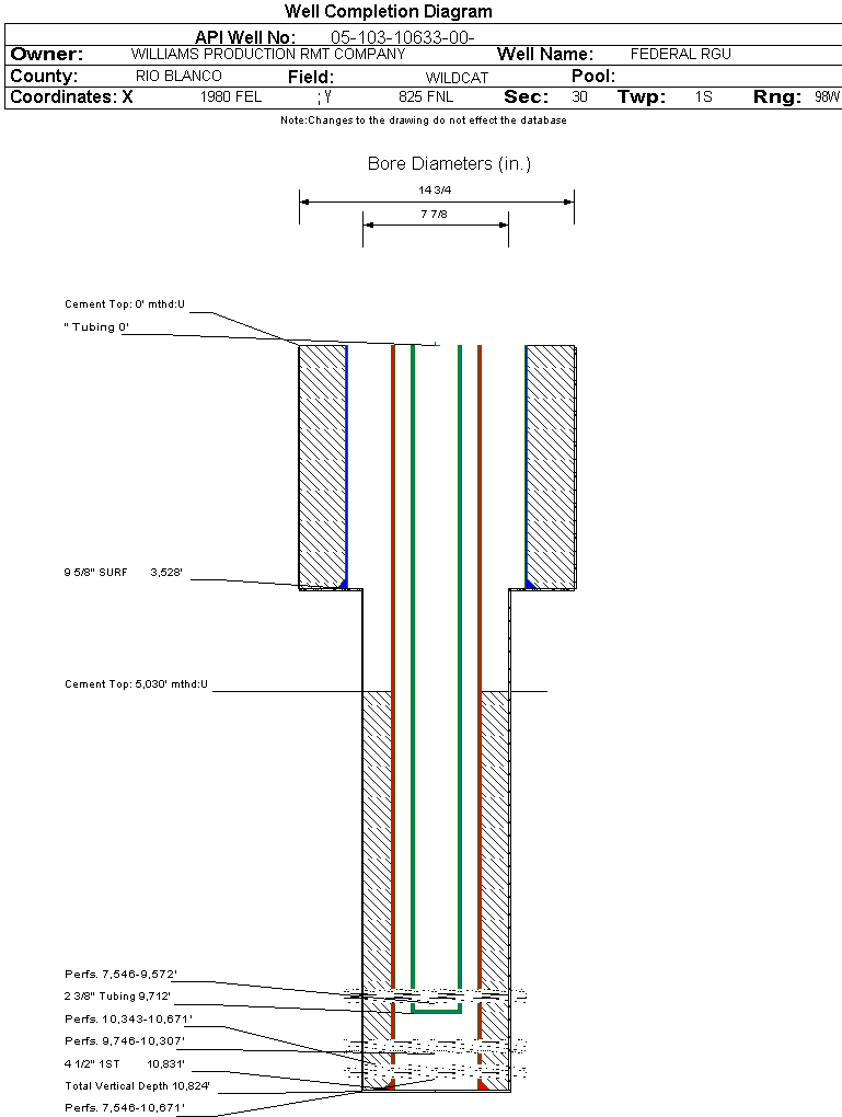 | Wellbore Completed | | Completion Date: | 6/9/2006 | | Spud Date: | 4/21/2006 | Spud Date Is: | ACTUAL | | Measured TD: | 10841 ft. | Measured PB depth: | 10758 ft. | | True Vertical TD: | 10824 ft. | True Vertical PB depth: | | | Top PZ Location: | Sec:30 Twp: 1S 98W | Footage: 1004 FNL 2241 FEL | | Bottom Hole Location: | Sec:30 Twp: 1S 98W | Footage: 1004 FNL 2241 FEL | | Log Types: | CBL; HIGH RESOLUTION INDUCTION/SPECTRAL DENSITY/DUAL SPACED NEUTRON; MUDLOG | | Casing: | String Type: SURF, Hole Size: 14.75 in., Size: 9.625 in., Top: 0 ft., Depth: 3528 ft., Weight: 36 , Citings Type: ACTUAL | | Cement: | Sacks: 2040, Top: 0 ft., Bottom: 3528 ft., Determination Method: CALC | | Casing: | String Type: 1ST, Hole Size: 7.875 in., Size: 4.5 in., Top: 0 ft., Depth: 10831 ft., Weight: 11.6 , Citings Type: ACTUAL | | Cement: | Sacks: 1670, Top: 5030 ft., Bottom: 10831 ft., Determination Method: CBL | | Formation | Interval Top | Log Bottom | Cored | DSTs | | WASATCH G | 4647 ft. | | N | N | | FORT UNION | 4926 ft. | | N | N | | MESAVERDE | 6429 ft. | | N | N | | CAMEO | 9149 ft. | | N | N | | ROLLINS | 9608 ft. | | N | N | | COZZETTE | 9710 ft. | | N | N | | CORCORAN | 9921 ft. | | N | N | | SEGO | 10300 ft. | | N | N |