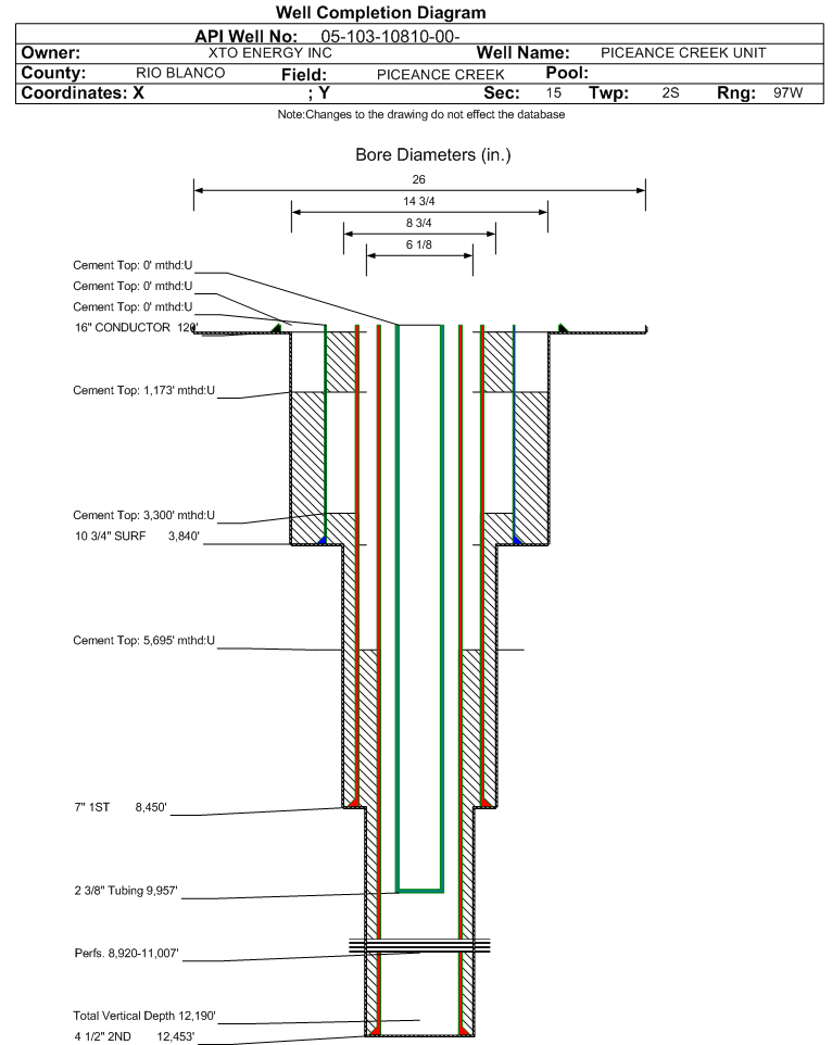 | Wellbore Completed | | Completion Date: | 4/20/2009 | | Spud Date: | 8/6/2008 | Spud Date Is: | ACTUAL | | Measured TD: | 12468 ft. | Measured PB depth: | 12366 ft. | | True Vertical TD: | 12190 ft. | True Vertical PB depth: | 12087 ft. | | Top PZ Location: | Sec:10 Twp: 2S 97W | Footage: 186 FSL 2420 FWL | | Bottom Hole Location: | Sec:10 Twp: 2S 97W | Footage: 186 FSL 2420 FWL | | Log Types: | | | Log Types: | MUD-5, AIL, HOLE VOL, DEN, GASVIEW, SONIC, RPM, MSS, RA BOND, DRILL MECH, IMAGING | | Log Types: | | | Log Types: | MUD LOGS, DIRECTIONAL, COMPACT WELL SHUTTLE ARRAY INDUCT. - HOLE VOLUME - COMP. PHOTO DENSITY, GASVIEW, DENSITY - COMP. SONIC, MSS MONOPOLE SEMBLANCE, RMP, RA BOND LOG, PERFORM DRILLING MECHANICS, IMAGING BEHIND CASING ULTRASONIC | | Casing: | String Type: CONDUCTOR, Hole Size: , Size: , Top: 0 ft., Depth: 118 ft., Weight: 60 , Citings Type: ACTUAL | | Cement: | Sacks: 96, Top: 0 ft., Bottom: 118 ft., Determination Method: VISU | | Casing: | String Type: SURF, Hole Size: 14.75 in., Size: 10.75 in., Top: 0 ft., Depth: 3828 ft., Weight: 45.5 , Citings Type: ACTUAL | | Cement: | Sacks: 1190, Top: 1173 ft., Bottom: 3828 ft., Determination Method: VISU | | Casing: | String Type: 1ST, Hole Size: 8.75 in., Size: , Top: 0 ft., Depth: 8437 ft., Weight: 26 , Citings Type: ACTUAL | | Cement: | Sacks: 760, Top: 3287 ft., Bottom: 8437 ft., Determination Method: CALC | | Casing: | String Type: S.C. 1.1, Hole Size: , Size: , Top: , Depth: 1173 ft., Weight: , Citings Type: ACTUAL | | Cement: | Sacks: 840, Top: 0 ft., Bottom: 1173 ft., Determination Method: CALC | | Casing: | String Type: 2ND, Hole Size: 6.25 in., Size: 4.5 in., Top: 0 ft., Depth: 12440 ft., Weight: 15.1 , Citings Type: ACTUAL | | Cement: | Sacks: 895, Top: 5683 ft., Bottom: 12440 ft., Determination Method: CBL | | Casing: | String Type: 3RD, Hole Size: , Size: , Top: , Depth: , Weight: , Citings Type: ACTUAL | | Cement: | Sacks: , Top: , Bottom: , Determination Method: CALC | | Casing: | String Type: STAGE TOOL, Hole Size: , Size: 10.75 in., Top: , Depth: 1173 ft., Weight: , Citings Type: ACTUAL | | Cement: | Sacks: 840, Top: 0 ft., Bottom: 1173 ft., Determination Method: VISU | | Formation | Interval Top | Log Bottom | Cored | DSTs | | WASATCH G | 5397 ft. | 7097 ft. | N | N | | OHIO CREEK | 7097 ft. | 7170 ft. | N | N | | WILLIAMS FORK - CAMEO | 7170 ft. | 11135 ft. | N | N | | ROLLINS | 11135 ft. | 11282 ft. | N | N | | COZZETTE | 11282 ft. | 11601 ft. | N | N | | CORCORAN | 11601 ft. | 12468 ft. | N | N |