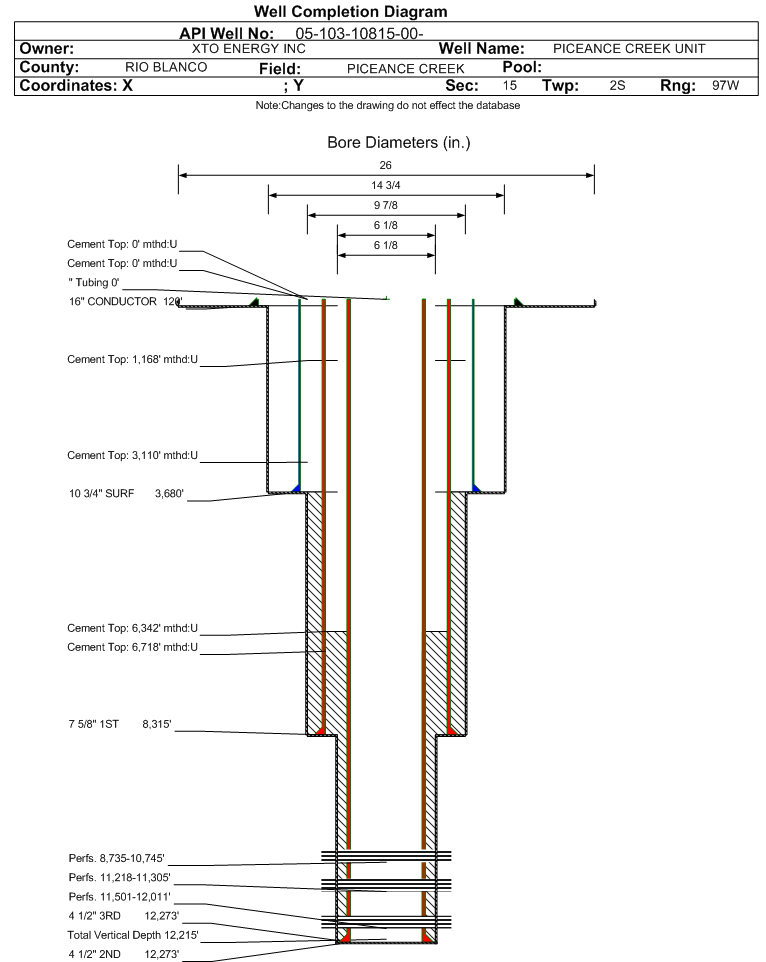 | Wellbore Completed | | Completion Date: | 3/14/2009 | | Spud Date: | 10/17/2008 | Spud Date Is: | ACTUAL | | Measured TD: | 12273 ft. | Measured PB depth: | 12171 ft. | | True Vertical TD: | 12215 ft. | True Vertical PB depth: | 12113 ft. | | Top PZ Location: | Sec:15 Twp: 2S 97W | Footage: 1546 FNL 1418 FWL | | Bottom Hole Location: | Sec:15 Twp: 2S 97W | Footage: 1546 FNL 1418 FWL | | Log Types: | | | Log Types: | RPM, RA BOND LOG, MUD LOGS, DIRECTIONAL SURVEY | | Log Types: | | | Log Types: | RPM, RA BOND LOG, GASVIEW, IMAGING BEHIND CASING ULTRASONIC TOOL, MUD LOGS, DIRECTIONAL SURVEY | | Casing: | String Type: CONDUCTOR, Hole Size: 26 in., Size: 16 in., Top: 0 ft., Depth: 120 ft., Weight: , Citings Type: ACTUAL | | Cement: | Sacks: 96, Top: 0 ft., Bottom: 120 ft., Determination Method: CALC | | Casing: | String Type: SURF, Hole Size: 14.75 in., Size: 10.75 in., Top: 0 ft., Depth: 3680 ft., Weight: 45,5 , Citings Type: ACTUAL | | Cement: | Sacks: 1110, Top: 1168 ft., Bottom: 3680 ft., Determination Method: CALC | | Casing: | String Type: 1ST, Hole Size: 9.875 in., Size: 7.625 in., Top: 0 ft., Depth: 8315 ft., Weight: 29.7 , Citings Type: ACTUAL | | Cement: | Sacks: 11030, Top: 3110 ft., Bottom: 8315 ft., Determination Method: CALC | | Casing: | String Type: S.C. 1.1, Hole Size: , Size: , Top: , Depth: 1168 ft., Weight: , Citings Type: ACTUAL | | Cement: | Sacks: 618, Top: 0 ft., Bottom: 1168 ft., Determination Method: | | Casing: | String Type: 2ND, Hole Size: 6.125 in., Size: 4.5 in., Top: 0 ft., Depth: 12273 ft., Weight: 15.1 , Citings Type: ACTUAL | | Cement: | Sacks: 930, Top: 6718 ft., Bottom: 12273 ft., Determination Method: CBL | | Casing: | String Type: 3RD, Hole Size: 6.125 in., Size: 4.5 in., Top: 0 ft., Depth: 12273 ft., Weight: , Citings Type: ACTUAL | | Cement: | Sacks: 930, Top: 6342 ft., Bottom: 12273 ft., Determination Method: CALC | | Formation | Interval Top | Log Bottom | Cored | DSTs | | WASATCH G | 5180 ft. | 6912 ft. | N | N | | OHIO CREEK | 6912 ft. | 6972 ft. | N | N | | WILLIAMS FORK - CAMEO | 6972 ft. | 10913 ft. | N | N | | ROLLINS | 10913 ft. | 11061 ft. | N | N | | COZZETTE | 11061 ft. | 11487 ft. | N | N | | CORCORAN | 11487 ft. | 12100 ft. | N | N |