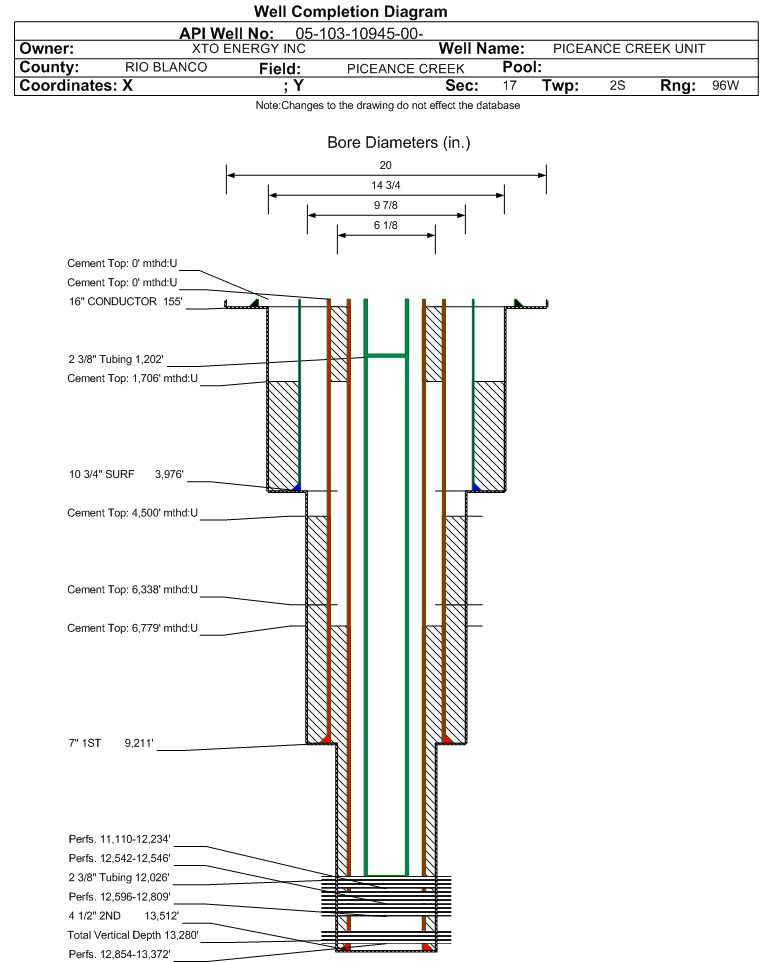 | Wellbore Completed | | Completion Date: | 6/3/2008 | | Spud Date: | 3/4/2008 | Spud Date Is: | ACTUAL | | Measured TD: | 13512 ft. | Measured PB depth: | 13439 ft. | | True Vertical TD: | 13280 ft. | True Vertical PB depth: | 13207 ft. | | Top PZ Location: | Sec:17 Twp: 2S 96W | Footage: 206 FSL 834 FEL | | Bottom Hole Location: | Sec:17 Twp: 2S 96W | Footage: 206 FSL 834 FEL | | Log Types: | MUD LOGS, ACOUSTIC CBL | | Casing: | String Type: CONDUCTOR, Hole Size: 20 in., Size: 16 in., Top: , Depth: 155 ft., Weight: , Citings Type: ACTUAL | | Cement: | Sacks: 230, Top: 0 ft., Bottom: 155 ft., Determination Method: CALC | | Casing: | String Type: SURF, Hole Size: 14.75 in., Size: 10.75 in., Top: , Depth: 3976 ft., Weight: , Citings Type: ACTUAL | | Cement: | Sacks: 790, Top: 1706 ft., Bottom: 3976 ft., Determination Method: CALC | | Casing: | String Type: 1ST, Hole Size: 9.875 in., Size: 7 in., Top: , Depth: 9211 ft., Weight: , Citings Type: ACTUAL | | Cement: | Sacks: 998, Top: 6338 ft., Bottom: 9211 ft., Determination Method: CALC | | Casing: | String Type: S.C. 1.1, Hole Size: , Size: , Top: , Depth: 6338 ft., Weight: , Citings Type: ACTUAL | | Cement: | Sacks: 871, Top: 4500 ft., Bottom: 6338 ft., Determination Method: CBL | | Casing: | String Type: 2ND, Hole Size: 6.125 in., Size: 4.5 in., Top: , Depth: 13512 ft., Weight: , Citings Type: ACTUAL | | Cement: | Sacks: 817, Top: 6779 ft., Bottom: 13512 ft., Determination Method: CALC | | Casing: | String Type: S.C. 2.2, Hole Size: , Size: , Top: , Depth: 1706 ft., Weight: , Citings Type: ACTUAL | | Cement: | Sacks: 730, Top: 0 ft., Bottom: 1706 ft., Determination Method: CALC | | Formation | Interval Top | Log Bottom | Cored | DSTs | | WASATCH G | 5951 ft. | 7890 ft. | N | N | | OHIO CREEK | 7890 ft. | 8058 ft. | N | N | | WILLIAMS FORK - CAMEO | 8058 ft. | 12340 ft. | N | N | | ROLLINS | 12340 ft. | 12572 ft. | N | N | | COZZETTE | 12572 ft. | 12833 ft. | N | N | | CORCORAN | 12833 ft. | 13512 ft. | N | N |