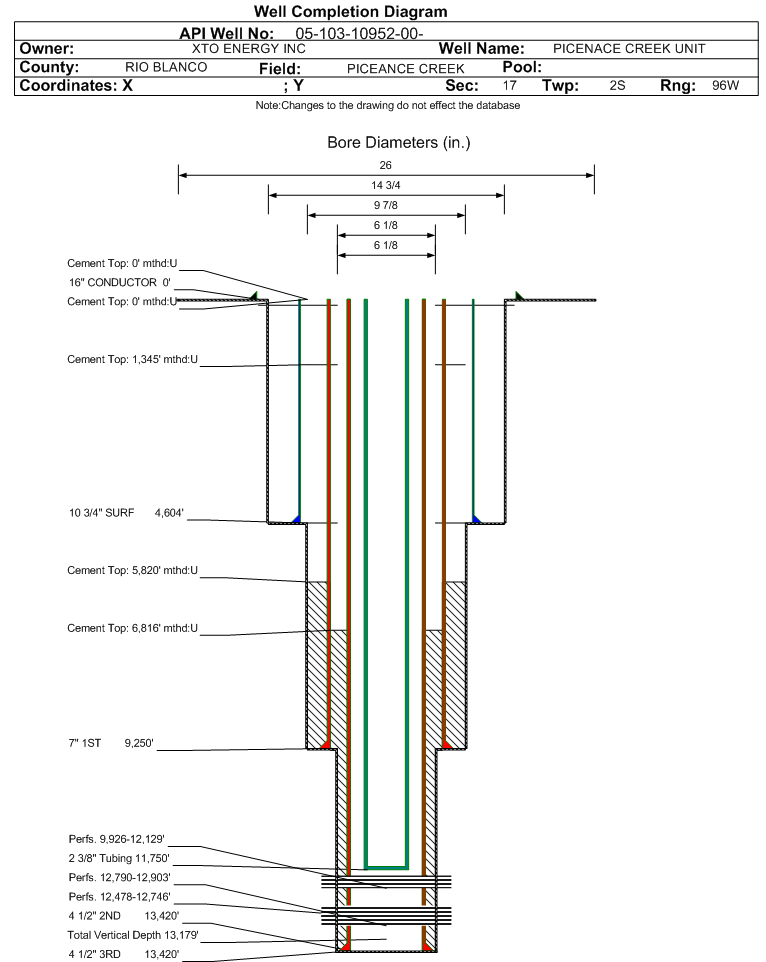 | Wellbore Completed | | Completion Date: | 12/8/2008 | | Spud Date: | 11/9/2008 | Spud Date Is: | ACTUAL | | Measured TD: | 13428 ft. | Measured PB depth: | | | True Vertical TD: | 13179 ft. | True Vertical PB depth: | | | Top PZ Location: | Sec:17 Twp: 2S 96W | Footage: 609 FSL 1450 FWL | | Bottom Hole Location: | Sec:17 Twp: 2S 96W | Footage: 609 FSL 1450 FWL | | Log Types: | ISOLATION SCANNER CMT GR, MUD LOGS, DIRECTIONAL SURVEY, SLIM CEMENT MAPPING TOOL VDL IMAGE GR-CCL | | Log Types: | ISOLATION SCANNER CMT GR, MUD, DIRECTIONAL SURVEY, SLIM CMT MAPPING TOOL VDL IMAGE GAMMA RAY-CCL | | Casing: | String Type: CONDUCTOR, Hole Size: 26 in., Size: 16 in., Top: , Depth: 0 ft., Weight: , Citings Type: ACTUAL | | Cement: | Sacks: 96, Top: 0 ft., Bottom: 120 ft., Determination Method: | | Casing: | String Type: SURF, Hole Size: 14.75 in., Size: 10.75 in., Top: , Depth: 4604 ft., Weight: , Citings Type: ACTUAL | | Cement: | Sacks: 1452, Top: 1345 ft., Bottom: 4604 ft., Determination Method: | | Casing: | String Type: 1ST, Hole Size: 9.875 in., Size: 7 in., Top: , Depth: 9250 ft., Weight: , Citings Type: ACTUAL | | Cement: | Sacks: 1142, Top: 5820 ft., Bottom: 9287 ft., Determination Method: CBL | | Casing: | String Type: S.C. 1.1, Hole Size: , Size: , Top: , Depth: 1345 ft., Weight: , Citings Type: ACTUAL | | Cement: | Sacks: 711, Top: 0 ft., Bottom: 1345 ft., Determination Method: | | Casing: | String Type: 2ND, Hole Size: 6.125 in., Size: 4.5 in., Top: , Depth: 13420 ft., Weight: , Citings Type: ACTUAL | | Cement: | Sacks: 994, Top: 6816 ft., Bottom: 13428 ft., Determination Method: CBL | | Casing: | String Type: 3RD, Hole Size: 6.125 in., Size: 4.5 in., Top: , Depth: 13420 ft., Weight: , Citings Type: ACTUAL | | Cement: | Sacks: 994, Top: 6816 ft., Bottom: 13428 ft., Determination Method: CALC | | Formation | Interval Top | Log Bottom | Cored | DSTs | | WASATCH G | 5886 ft. | 7797 ft. | N | N | | OHIO CREEK | 7797 ft. | 7973 ft. | N | N | | WILLIAMS FORK - CAMEO | 7973 ft. | 12277 ft. | N | N | | ROLLINS | 12277 ft. | 12426 ft. | N | N | | COZZETTE | 12426 ft. | 12780 ft. | N | N | | CORCORAN | 12780 ft. | 13428 ft. | N | N |