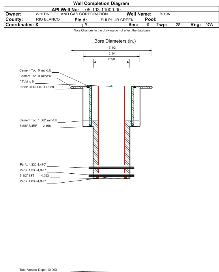 | Wellbore Completed | | Completion Date: | 1/19/2008 | | Spud Date: | 12/20/2007 | Spud Date Is: | ACTUAL | | Measured TD: | 5000 ft. | Measured PB depth: | 4963 ft. | | True Vertical TD: | | True Vertical PB depth: | | | Top PZ Location: | Sec: Twp: | Footage: 1148 FSL 1438 FWL | | Bottom Hole Location: | Sec:19 Twp: 2S 97W | Footage: 1027 FSL 1717 FWL | | Log Types: | AISF, HOLE VOLUME, MICRO RESISTIVITY, CPD/CDN | | Casing: | String Type: CONDUCTOR, Hole Size: 17.5 in., Size: 9.625 in., Top: 0 ft., Depth: 80 ft., Weight: , Citings Type: ACTUAL | | Cement: | Sacks: , Top: 0 ft., Bottom: 80 ft., Determination Method: CALC | | Casing: | String Type: SURF, Hole Size: 12.25 in., Size: 8.625 in., Top: 0 ft., Depth: 2168 ft., Weight: 24 , Citings Type: ACTUAL | | Cement: | Sacks: 999, Top: 0 ft., Bottom: 2168 ft., Determination Method: CALC | | Casing: | String Type: 1ST, Hole Size: 7.875 in., Size: 5.5 in., Top: 0 ft., Depth: 4993 ft., Weight: 17 , Citings Type: ACTUAL | | Cement: | Sacks: 602, Top: 1862 ft., Bottom: 4993 ft., Determination Method: CBL | | Formation | Interval Top | Log Bottom | Cored | DSTs | | WASATCH B | 2681 ft. | | N | N | | WASATCH D | 3065 ft. | | N | N | | WASATCH F | 3621 ft. | | N | N | | WASATCH G | 3795 ft. | | N | N | | FORT UNION | 4571 ft. | | N | N |