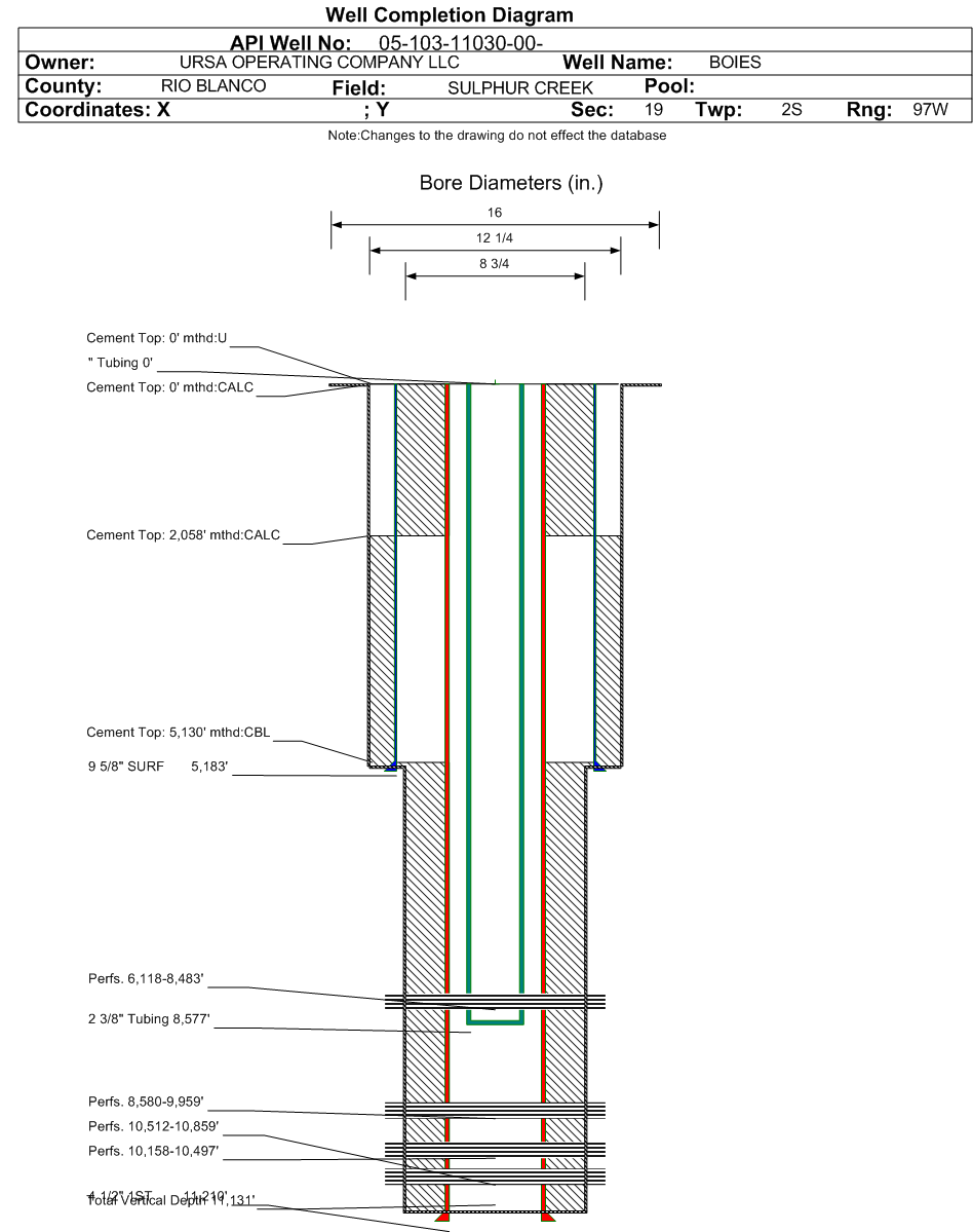 | Wellbore Completed | | Completion Date: | 5/13/2008 | | Spud Date: | 4/18/2008 | Spud Date Is: | ACTUAL | | Measured TD: | 11210 ft. | Measured PB depth: | 10868 ft. | | True Vertical TD: | 11131 ft. | True Vertical PB depth: | 10789 ft. | | Top PZ Location: | Sec:30 Twp: 2S 97W | Footage: 147 FNL 455 FEL | | Bottom Hole Location: | Sec:30 Twp: 2S 97W | Footage: 147 FNL 455 FEL | | Log Types: | CBL, MUD, AI/GR/SP; L/CN/AIT; AISF, CPD/CDN; HOLE VOLUME | | Casing: | String Type: CONDUCTOR, Hole Size: 16 in., Size: , Top: , Depth: , Weight: , Citings Type: ACTUAL | | Cement: | Sacks: , Top: , Bottom: , Determination Method: | | Casing: | String Type: SURF, Hole Size: 12.25 in., Size: 9.625 in., Top: 0 ft., Depth: 5183 ft., Weight: 36 , Citings Type: ACTUAL | | Cement: | Sacks: 606, Top: 2058 ft., Bottom: 5183 ft., Determination Method: CALC | | Casing: | String Type: 1ST, Hole Size: 8.75 in., Size: 4.5 in., Top: 0 ft., Depth: 11210 ft., Weight: 11.6 , Citings Type: ACTUAL | | Cement: | Sacks: 828, Top: 5130 ft., Bottom: 11210 ft., Determination Method: CBL | | Casing: | String Type: S.C. 1.1, Hole Size: , Size: , Top: , Depth: 2058 ft., Weight: , Citings Type: ACTUAL | | Cement: | Sacks: 336, Top: 0 ft., Bottom: 2058 ft., Determination Method: CALC | | Formation | Interval Top | Log Bottom | Cored | DSTs | | OHIO CREEK | 6104 ft. | | N | N | | WILLIAMS FORK | 6300 ft. | | N | N | | CAMEO | 9503 ft. | | N | N | | ROLLINS | 10016 ft. | | N | N | | COZZETTE | 10154 ft. | | N | N | | CORCORAN | 10510 ft. | | N | N |