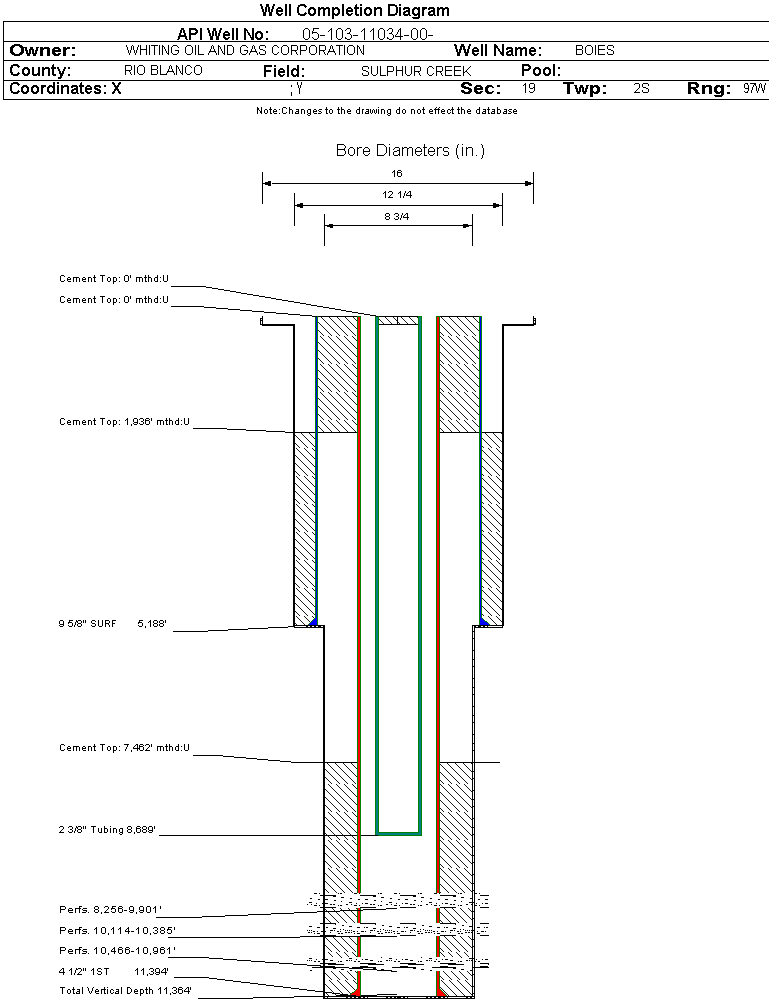 | Wellbore Completed | | Completion Date: | 3/22/2008 | | Spud Date: | 2/24/2008 | Spud Date Is: | ACTUAL | | Measured TD: | 11394 ft. | Measured PB depth: | 11319 ft. | | True Vertical TD: | 11364 ft. | True Vertical PB depth: | 11289 ft. | | Top PZ Location: | Sec:19 Twp: 2S 97W | Footage: 538 FSL 612 FEL | | Bottom Hole Location: | Sec:19 Twp: 2S 97W | Footage: 538 FSL 612 FEL | | Log Types: | AL, HVC, CPD/CPN, TRIPLE COMB, CBL | | Casing: | String Type: CONDUCTOR, Hole Size: , Size: , Top: 0 ft., Depth: 130 ft., Weight: UNK , Citings Type: ACTUAL | | Cement: | Sacks: , Top: 0 ft., Bottom: 130 ft., Determination Method: | | Casing: | String Type: SURF, Hole Size: 12.25 in., Size: 9.625 in., Top: , Depth: 5188 ft., Weight: 36 , Citings Type: ACTUAL | | Cement: | Sacks: 595, Top: 1936 ft., Bottom: 5188 ft., Determination Method: VISU | | Casing: | String Type: 1ST, Hole Size: 8.75 in., Size: 4.5 in., Top: , Depth: 11394 ft., Weight: 11.60 , Citings Type: ACTUAL | | Cement: | Sacks: 1042, Top: 7462 ft., Bottom: 11394 ft., Determination Method: CALC | | Casing: | String Type: S.C. 1.1, Hole Size: , Size: , Top: , Depth: 1936 ft., Weight: , Citings Type: ACTUAL | | Cement: | Sacks: 480, Top: 0 ft., Bottom: 1936 ft., Determination Method: CALC | | Casing: | String Type: STAGE TOOL, Hole Size: , Size: 9.625 in., Top: , Depth: 1936 ft., Weight: - , Citings Type: ACTUAL | | Cement: | Sacks: 480, Top: 0 ft., Bottom: 1936 ft., Determination Method: VISU | | Formation | Interval Top | Log Bottom | Cored | DSTs | | OHIO CREEK | 6014 ft. | | N | N | | WILLIAMS FORK | 6189 ft. | | N | N | | CAMEO | 9461 ft. | | N | N | | ROLLINS | 9968 ft. | | N | N | | COZZETTE | 10110 ft. | | N | N | | CORCORAN | 10461 ft. | | N | N | | SEGO | 11252 ft. | | N | N |