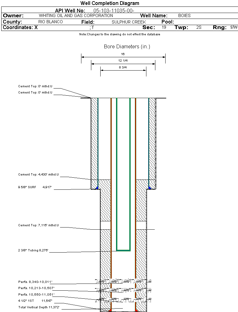 | Wellbore Completed | | Completion Date: | 6/6/2008 | | Spud Date: | 5/14/2008 | Spud Date Is: | ACTUAL | | Measured TD: | 11547 ft. | Measured PB depth: | | | True Vertical TD: | 11372 ft. | True Vertical PB depth: | | | Top PZ Location: | Sec:30 Twp: 2S 97W | Footage: 779 FNL 565 FEL | | Bottom Hole Location: | Sec:30 Twp: 2S 97W | Footage: 779 FNL 565 FEL | | Log Types: | HOLE VOLUME, DENS/NEU, IND, MUD | | Casing: | String Type: CONDUCTOR, Hole Size: 16 in., Size: , Top: , Depth: , Weight: , Citings Type: ACTUAL | | Cement: | Sacks: , Top: , Bottom: , Determination Method: | | Casing: | String Type: SURF, Hole Size: 12.25 in., Size: 9.625 in., Top: 0 ft., Depth: 4917 ft., Weight: , Citings Type: ACTUAL | | Cement: | Sacks: 942, Top: 0 ft., Bottom: 4917 ft., Determination Method: CALC | | Casing: | String Type: 1ST, Hole Size: 8.75 in., Size: 4.5 in., Top: 0 ft., Depth: 11547 ft., Weight: , Citings Type: ACTUAL | | Cement: | Sacks: 610, Top: 7115 ft., Bottom: 11547 ft., Determination Method: CBL | | Casing: | String Type: S.C. 1.1, Hole Size: , Size: , Top: , Depth: 6602 ft., Weight: , Citings Type: ACTUAL | | Cement: | Sacks: 316, Top: 4430 ft., Bottom: 6662 ft., Determination Method: CBL | | Formation | Interval Top | Log Bottom | Cored | DSTs | | OHIO CREEK | 6126 ft. | | N | N | | CAMEO | 6381 ft. | | N | N | | WILLIAMS FORK | 6381 ft. | | N | N | | ROLLINS | 10072 ft. | | N | N | | COZZETTE | 10210 ft. | | N | N | | CORCORAN | 10544 ft. | | N | N | | SEGO | 11339 ft. | | N | N |