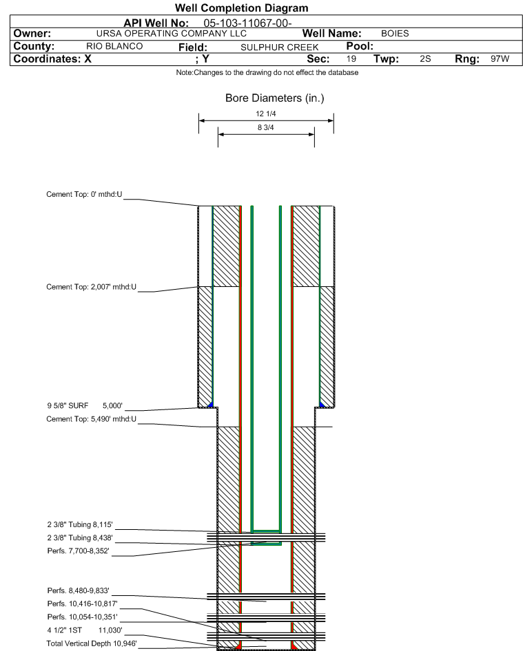 Wellbore #00 Wellbore Classification: GW Status: SI - 2/1/2024 Measured TD: 11030 ft. Vertical TD: 10946 ft.| Wellbore Data for Original Wellbore | Wellbore Classification: GW SI - 2/1/2024 | | Wellbore Permit | DIRECTIONAL | | Permit #: | 20073422 | Expiration Date: | 8/14/2008 | | Proposed Top PZ Location: | Sec:19 Twp: 2S 97W | Footage: 509 FSL 1916 FEL | | Bottom Hole Location: | Sec:19 Twp: 2S 97W | Footage: 509 FSL 1916 FEL | | Proposed Depth/Form: | 11339 ft. | | Surface Mineral Owner Same: | Yes | | Mineral Owner: | FEE | Surface Owner: | FEE | | Unit: | | Unit Number: | | | Formation And Spacing: | Code: ILES , Formation: ILES , Order: 527-2 , Unit Acreage: , Drill Unit: | | Formation And Spacing: | Code: SEGO , Formation: SEGO , Order: 527-2 , Unit Acreage: , Drill Unit: | | Formation And Spacing: | Code: WMFK , Formation: WILLIAMS FORK , Order: 527-1 , Unit Acreage: , Drill Unit: |