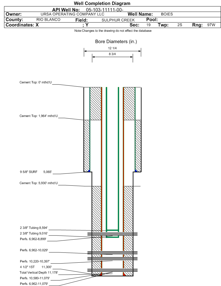 Wellbore #00 Wellbore Classification: GW Status: PR - 3/1/2022 Measured TD: 11301 ft. Vertical TD: 11178 ft.| Wellbore Data for Original Wellbore | Wellbore Classification: GW PR - 3/1/2022 | | Wellbore Permit | DIRECTIONAL | | Permit #: | 20074792 | Expiration Date: | 11/1/2008 | | Proposed Top PZ Location: | Sec:19 Twp: 2S 97W | Footage: 1176 442 | | Bottom Hole Location: | Sec:19 Twp: 2S 97W | Footage: 1176 442 | | Proposed Depth/Form: | 11458 ft. | | Surface Mineral Owner Same: | Yes | | Mineral Owner: | FEE | Surface Owner: | FEE | | Unit: | | Unit Number: | | | Formation And Spacing: | Code: ILES , Formation: ILES , Order: 527-4 , Unit Acreage: , Drill Unit: | | Formation And Spacing: | Code: SEGO , Formation: SEGO , Order: 527-4 , Unit Acreage: , Drill Unit: | | Formation And Spacing: | Code: WMFK , Formation: WILLIAMS FORK , Order: 527-1 , Unit Acreage: , Drill Unit: | | Casing: | String Type: CONDUCTOR, Hole Size: 26 in., Size: 26 in., Top: , Depth: 100 ft., Weight: 54 , Citings Type: PLANNED | | Cement: | Sacks: , Top: , Bottom: |