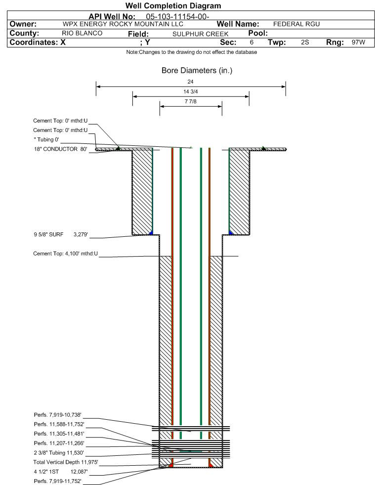 | | Perforation Data: | | Interval Top: | 11588 ft. | # Of Holes: | 19 | | Interval Bottom: | 11752 ft. | Hole Size: | 0.36 in. |