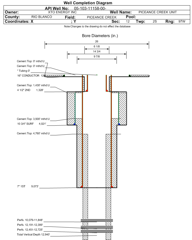| Wellbore Completed | | Completion Date: | 10/12/2009 | | Spud Date: | 9/15/2008 | Spud Date Is: | ACTUAL | | Measured TD: | 13295 ft. | Measured PB depth: | 13192 ft. | | True Vertical TD: | 12940 ft. | True Vertical PB depth: | 12836 ft. | | Top PZ Location: | Sec:12 Twp: 2S 97W | Footage: 2301 FSL 2012 FWL | | Bottom Hole Location: | Sec:12 Twp: 2S 97W | Footage: 2301 FSL 2012 FWL | | Log Types: | | | Log Types: | | | Log Types: | | | Log Types: | PERFORM - APWD, IMAGING BEHIND CASING, CORRELATION PRINT CCL/GAMMA RAY, 5- MUD LOGS, RESERVOIR PERFORMANCE MONITOR, RADIAL ANALYSIS BOND LOG, DIRECTIONAL SURVEY | | Casing: | String Type: CONDUCTOR, Hole Size: 26 in., Size: 16 in., Top: 0 ft., Depth: 120 ft., Weight: , Citings Type: ACTUAL | | Cement: | Sacks: 96, Top: 0 ft., Bottom: 120 ft., Determination Method: CALC | | Casing: | String Type: SURF, Hole Size: 14.75 in., Size: 10.75 in., Top: 1430 ft., Depth: 4021 ft., Weight: 45.5 , Citings Type: ACTUAL | | Cement: | Sacks: 1170, Top: 1430 ft., Bottom: 4021 ft., Determination Method: CALC | | Casing: | String Type: 1ST, Hole Size: 9.875 in., Size: 7 in., Top: 0 ft., Depth: 9073 ft., Weight: 26 , Citings Type: ACTUAL | | Cement: | Sacks: 1345, Top: 3500 ft., Bottom: 9073 ft., Determination Method: CALC | | Casing: | String Type: S.C. 1.2, Hole Size: , Size: , Top: , Depth: 1430 ft., Weight: , Citings Type: ACTUAL | | Cement: | Sacks: 808, Top: 0 ft., Bottom: 1430 ft., Determination Method: CALC | | Casing: | String Type: 2ND, Hole Size: 6.125 in., Size: 4.5 in., Top: 0 ft., Depth: 1328 ft., Weight: 15.1 , Citings Type: ACTUAL | | Cement: | Sacks: 935, Top: 4760 ft., Bottom: 13295 ft., Determination Method: CALC | | Formation | Interval Top | Log Bottom | Cored | DSTs | | WASATCH G | 5780 ft. | 7620 ft. | N | N | | OHIO CREEK | 7620 ft. | 8190 ft. | N | N | | WILLIAMS FORK - CAMEO | 8190 ft. | 11950 ft. | N | N | | ROLLINS | 11950 ft. | 12160 ft. | N | N | | COZZETTE | 12160 ft. | 12450 ft. | N | N | | CORCORAN | 12450 ft. | 13300 ft. | N | N |