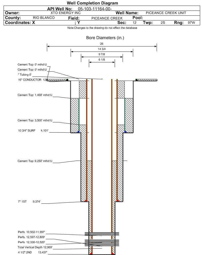 | Wellbore Completed | | Completion Date: | 11/15/2009 | | Spud Date: | 10/18/2008 | Spud Date Is: | ACTUAL | | Measured TD: | 13445 ft. | Measured PB depth: | 13347 ft. | | True Vertical TD: | 12969 ft. | True Vertical PB depth: | 12871 ft. | | Top PZ Location: | Sec:12 Twp: 2S 97W | Footage: 1600 FNL 1082 FWL | | Bottom Hole Location: | Sec:12 Twp: 2S 97W | Footage: 1600 FNL 1082 FWL | | Log Types: | PERFORM-APWD, GASVIEW, RESERVOIR PERF. MONITOR(2), SEGMENTED BOND LOG GAMMA RAY, 5-MUD LOGS, DIRECTIONAL SURVEY, RADIAL BOND LOG | | Log Types: | | | Log Types: | | | Log Types: | | | Casing: | String Type: CONDUCTOR, Hole Size: 26 in., Size: 16 in., Top: 0 ft., Depth: 120 ft., Weight: , Citings Type: ACTUAL | | Cement: | Sacks: 96, Top: 0 ft., Bottom: 120 ft., Determination Method: | | Casing: | String Type: SURF, Hole Size: 14.75 in., Size: 10.75 in., Top: 1468 ft., Depth: 4101 ft., Weight: , Citings Type: ACTUAL | | Cement: | Sacks: 1170, Top: 1468 ft., Bottom: 4101 ft., Determination Method: | | Casing: | String Type: 1ST, Hole Size: 9.875 in., Size: 7 in., Top: 0 ft., Depth: 9374 ft., Weight: , Citings Type: ACTUAL | | Cement: | Sacks: 1385, Top: 3500 ft., Bottom: 9374 ft., Determination Method: | | Casing: | String Type: S.C. 1.1, Hole Size: , Size: , Top: , Depth: 1468 ft., Weight: , Citings Type: ACTUAL | | Cement: | Sacks: 970, Top: 0 ft., Bottom: 1468 ft., Determination Method: | | Casing: | String Type: 2ND, Hole Size: 6.125 in., Size: 4.5 in., Top: 0 ft., Depth: 13437 ft., Weight: , Citings Type: ACTUAL | | Cement: | Sacks: 940, Top: 6250 ft., Bottom: 13437 ft., Determination Method: CBL | | Formation | Interval Top | Log Bottom | Cored | DSTs | | WASATCH G | 5935 ft. | 7870 ft. | N | N | | OHIO CREEK | 7870 ft. | 8480 ft. | N | N | | WILLIAMS FORK - CAMEO | 8480 ft. | 12130 ft. | N | N | | ROLLINS | 12130 ft. | 12320 ft. | N | N | | COZZETTE | 12320 ft. | 12625 ft. | N | N | | CORCORAN | 12625 ft. | 13445 ft. | N | N |