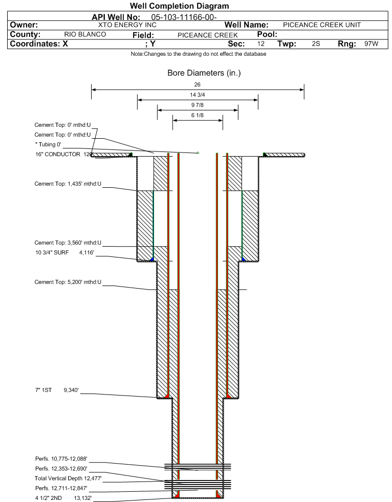 | Wellbore Completed | | Completion Date: | 11/3/2009 | | Spud Date: | 8/25/2008 | Spud Date Is: | ACTUAL | | Measured TD: | 13150 ft. | Measured PB depth: | 13043 ft. | | True Vertical TD: | 12477 ft. | True Vertical PB depth: | 12370 ft. | | Top PZ Location: | Sec:12 Twp: 2S 97W | Footage: 1084 FSL 2561 FWL | | Bottom Hole Location: | Sec:12 Twp: 2S 97W | Footage: 1084 FSL 2561 FWL | | Log Types: | MUD LOGS, PERFORM-APWD, CORRELATION PRINT, IMAGING BEHIND CASING ULTRASONIC TOOL, DIRECTIONAL SURVEY, RESERVIOR PERFORMANCE MONITOR, RADIAL ANALYSIS BOND LOG | | Log Types: | | | Log Types: | | | Log Types: | | | Casing: | String Type: CONDUCTOR, Hole Size: 26 in., Size: 16 in., Top: 0 ft., Depth: 120 ft., Weight: , Citings Type: ACTUAL | | Cement: | Sacks: 96, Top: 0 ft., Bottom: 120 ft., Determination Method: | | Casing: | String Type: SURF, Hole Size: 14.75 in., Size: 10.75 in., Top: 1435 ft., Depth: 4116 ft., Weight: , Citings Type: ACTUAL | | Cement: | Sacks: 1180, Top: 1435 ft., Bottom: 4116 ft., Determination Method: | | Casing: | String Type: 1ST, Hole Size: 9.875 in., Size: 7 in., Top: 0 ft., Depth: 9340 ft., Weight: , Citings Type: ACTUAL | | Cement: | Sacks: 1405, Top: 3560 ft., Bottom: 9324 ft., Determination Method: | | Casing: | String Type: S.C. 1.1, Hole Size: , Size: , Top: , Depth: 1435 ft., Weight: , Citings Type: ACTUAL | | Cement: | Sacks: 890, Top: 0 ft., Bottom: 1435 ft., Determination Method: | | Casing: | String Type: 2ND, Hole Size: 6.125 in., Size: 4.5 in., Top: 0 ft., Depth: 13132 ft., Weight: , Citings Type: ACTUAL | | Cement: | Sacks: 950, Top: 5200 ft., Bottom: 13150 ft., Determination Method: CBL | | Formation | Interval Top | Log Bottom | Cored | DSTs | | WASATCH G | 5950 ft. | 7910 ft. | N | N | | OHIO CREEK | 7910 ft. | 8480 ft. | N | N | | WILLIAMS FORK-CAMEO COAL | 8480 ft. | 12195 ft. | N | N | | ROLLINS | 12195 ft. | 12445 ft. | N | N | | COZZETTE | 12445 ft. | 12705 ft. | N | N | | CORCORAN | 12705 ft. | 13151 ft. | N | N |