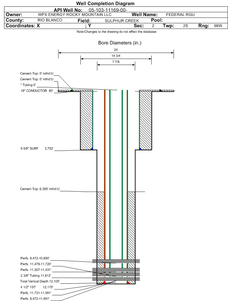 | Wellbore Completed | | Completion Date: | 10/14/2008 | | Spud Date: | 8/17/2008 | Spud Date Is: | ACTUAL | | Measured TD: | 12202 ft. | Measured PB depth: | 12189 ft. | | True Vertical TD: | 12105 ft. | True Vertical PB depth: | 12092 ft. | | Top PZ Location: | Sec:2 Twp: 2S 98W | Footage: 768 FNL 836 FEL | | Bottom Hole Location: | Sec:2 Twp: 2S 98W | Footage: 768 FNL 836 FEL | | Log Types: | CBL; RMTE, MUD | | Casing: | String Type: CONDUCTOR, Hole Size: 24 in., Size: 18 in., Top: 48 ft., Depth: 80 ft., Weight: 48 , Citings Type: ACTUAL | | Cement: | Sacks: 135, Top: 0 ft., Bottom: 80 ft., Determination Method: CALC | | Casing: | String Type: SURF, Hole Size: 14.75 in., Size: 9.625 in., Top: 0 ft., Depth: 3752 ft., Weight: 36 , Citings Type: ACTUAL | | Cement: | Sacks: 2875, Top: 0 ft., Bottom: 3752 ft., Determination Method: CALC | | Casing: | String Type: 1ST, Hole Size: 7.875 in., Size: 4.5 in., Top: 0 ft., Depth: 12175 ft., Weight: 11.6 , Citings Type: ACTUAL | | Cement: | Sacks: 1550, Top: 6395 ft., Bottom: 12175 ft., Determination Method: CBL | | Formation | Interval Top | Log Bottom | Cored | DSTs | | MESAVERDE | 7360 ft. | | N | N | | CAMEO | 10577 ft. | | N | N | | ROLLINS | 10999 ft. | | N | N | | COZZETTE | 11134 ft. | | N | N | | CORCORAN | 11361 ft. | | N | N | | SEGO | 11732 ft. | | N | N |