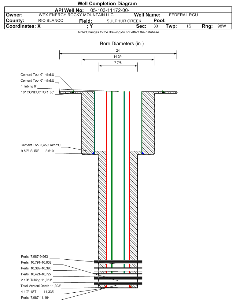 | Wellbore Completed | | Completion Date: | 7/29/2008 | | Spud Date: | 7/6/2008 | Spud Date Is: | ACTUAL | | Measured TD: | 11355 ft. | Measured PB depth: | 11248 ft. | | True Vertical TD: | 11303 ft. | True Vertical PB depth: | | | Top PZ Location: | Sec:33 Twp: 1S 98W | Footage: 2468 FSL 1948 FWL | | Bottom Hole Location: | Sec:33 Twp: 1S 98W | Footage: 2468 FSL 1948 FWL | | Log Types: | CBL, HRI-SPECTRAL DENS- DUAL SPACED NEUTRON; MUD; RMTE | | Casing: | String Type: CONDUCTOR, Hole Size: 24 in., Size: 18 in., Top: , Depth: 80 ft., Weight: 48 , Citings Type: ACTUAL | | Cement: | Sacks: 135, Top: 0 ft., Bottom: 80 ft., Determination Method: CALC | | Casing: | String Type: SURF, Hole Size: 14.75 in., Size: 9.625 in., Top: 0 ft., Depth: 3610 ft., Weight: , Citings Type: ACTUAL | | Cement: | Sacks: 1566, Top: 0 ft., Bottom: 3610 ft., Determination Method: CALC | | Casing: | String Type: 1ST, Hole Size: 7.875 in., Size: 4.5 in., Top: 0 ft., Depth: 11335 ft., Weight: , Citings Type: ACTUAL | | Cement: | Sacks: 1705, Top: 3450 ft., Bottom: 11335 ft., Determination Method: CBL | | Formation | Interval Top | Log Bottom | Cored | DSTs | | MESAVERDE | 6685 ft. | | N | N | | CAMEO | 9675 ft. | | N | N | | ROLLINS | 10048 ft. | | N | N | | COZZETTE | 10176 ft. | | N | N | | CORCORAN | 10399 ft. | | N | N | | SEGO | 10767 ft. | | N | N |