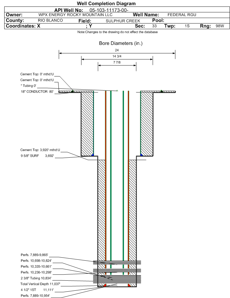 Wellbore #00 Wellbore Classification: GW Status: PR - 12/7/2007 Measured TD: 11124 ft. Vertical TD: 11037 ft.| Wellbore Data for Original Wellbore | Wellbore Classification: GW PR - 12/7/2007 | | Wellbore Permit | DIRECTIONAL | | Permit #: | 20076935 | Expiration Date: | 2/3/2009 | | Proposed Top PZ Location: | Sec: Twp: | Footage: 487 FSL 1900 FWL | | Bottom Hole Location: | Sec:33 Twp: 1S 98W | Footage: 487 FSL 1900 FWL | | Proposed Depth/Form: | 11156 ft. | | Surface Mineral Owner Same: | Yes | | Mineral Owner: | FEDERAL | Surface Owner: | FEDERAL | | Unit: | RYAN GULCH UNIT | Unit Number: | COC068239X | | Formation And Spacing: | Code: ILES , Formation: ILES , Order: , Unit Acreage: , Drill Unit: | | Formation And Spacing: | Code: SEGO , Formation: SEGO , Order: , Unit Acreage: , Drill Unit: | | Formation And Spacing: | Code: WMFK , Formation: WILLIAMS FORK , Order: , Unit Acreage: , Drill Unit: | | Formation And Spacing: | Code: WSTC , Formation: WASATCH , Order: , Unit Acreage: , Drill Unit: |