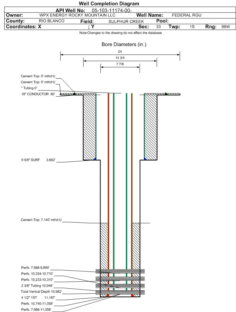 | Wellbore Completed | | Completion Date: | 10/12/2008 | | Spud Date: | 9/11/2008 | Spud Date Is: | ACTUAL | | Measured TD: | 11197 ft. | Measured PB depth: | 11151 ft. | | True Vertical TD: | 10982 ft. | True Vertical PB depth: | | | Top PZ Location: | Sec:33 Twp: 1S 98W | Footage: 231 FSL 584 FWL | | Bottom Hole Location: | Sec:33 Twp: 1S 98W | Footage: 231 FSL 584 FWL | | Log Types: | CBL, HRI, SPECTRAL DENSITY, DUAL SPACED NEUTRON; MUD | | Casing: | String Type: CONDUCTOR, Hole Size: 24 in., Size: 18 in., Top: 0 ft., Depth: 80 ft., Weight: 48 , Citings Type: ACTUAL | | Cement: | Sacks: 135, Top: 0 ft., Bottom: 80 ft., Determination Method: CALC | | Casing: | String Type: SURF, Hole Size: 14.75 in., Size: 9.625 in., Top: 0 ft., Depth: 3662 ft., Weight: 36 , Citings Type: ACTUAL | | Cement: | Sacks: 2745, Top: 0 ft., Bottom: 3662 ft., Determination Method: CALC | | Casing: | String Type: 1ST, Hole Size: 7.875 in., Size: 4.5 in., Top: 0 ft., Depth: 11187 ft., Weight: 11.6 , Citings Type: ACTUAL | | Cement: | Sacks: 1370, Top: 7140 ft., Bottom: 11187 ft., Determination Method: CBL | | Formation | Interval Top | Log Bottom | Cored | DSTs | | MESAVERDE | 6645 ft. | | N | N | | CAMEO | 9612 ft. | | N | N | | ROLLINS | 9974 ft. | | N | N | | COZZETTE | 10101 ft. | | N | N | | CORCORAN | 10318 ft. | | N | N | | SEGO | 10694 ft. | | N | N |