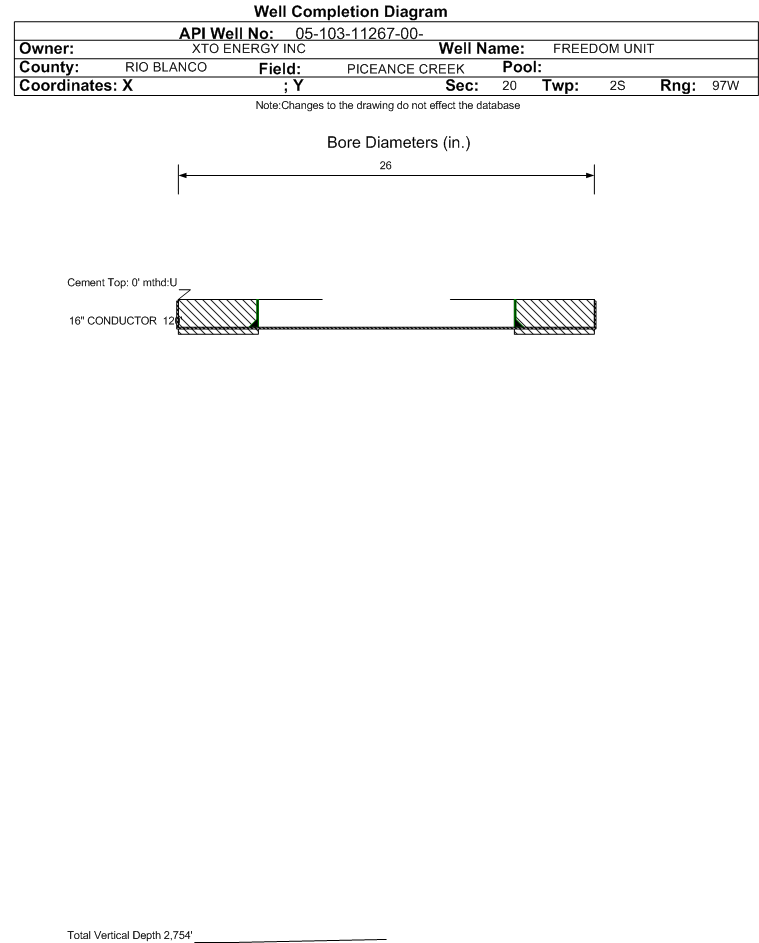 Wellbore #00 Wellbore Classification: GW Status: AB - 3/15/2009 Measured TD: 2789 ft. Vertical TD: 2754 ft.| Wellbore Data for Original Wellbore | Wellbore Classification: GW AB - 3/15/2009 | | Wellbore Permit | DIRECTIONAL | | Permit #: | 20081242 | Expiration Date: | 4/27/2009 | | Proposed Top PZ Location: | Sec: Twp: | Footage: 2620 FSL 238 FEL | | Bottom Hole Location: | Sec:20 Twp: 2S 97W | Footage: 2620 FSL 238 FEL | | Proposed Depth/Form: | 12100 ft. | | Surface Mineral Owner Same: | No | | Mineral Owner: | FEDERAL | Surface Owner: | FEE | | Unit: | FREEDOM UNIT | Unit Number: | COC69547X | | Formation And Spacing: | Code: MVRD , Formation: MESAVERDE , Order: , Unit Acreage: , Drill Unit: | | Formation And Spacing: | Code: OHCRK , Formation: OHIO CREEK , Order: , Unit Acreage: , Drill Unit: | | Formation And Spacing: | Code: WSTC , Formation: WASATCH , Order: , Unit Acreage: , Drill Unit: | | Casing: | String Type: SURF, Hole Size: 14.75 in., Size: 10.75 in., Top: , Depth: 3600 ft., Weight: 45/5 , Citings Type: PLANNED | | Cement: | Sacks: 2010, Top: 0 ft., Bottom: 3600 ft. | | Casing: | String Type: 1ST, Hole Size: 9.875 in., Size: 7 in., Top: , Depth: 8000 ft., Weight: 26 , Citings Type: PLANNED | | Cement: | Sacks: 1310, Top: 3100 ft., Bottom: 8000 ft. | | Casing: | String Type: 2ND, Hole Size: 6.125 in., Size: 4.5 in., Top: , Depth: 12100 ft., Weight: 15.1 , Citings Type: PLANNED | | Cement: | Sacks: 620, Top: 5600 ft., Bottom: 12100 ft. |
