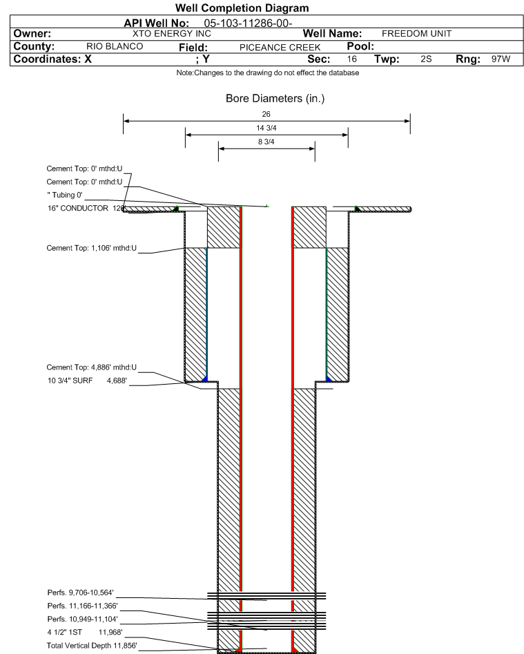 Wellbore #00 Wellbore Classification: GW Status: PR - 6/1/2013 Measured TD: 11970 ft. Vertical TD: 11856 ft.| Wellbore Data for Original Wellbore | Wellbore Classification: GW PR - 6/1/2013 | | Wellbore Permit | DIRECTIONAL | | Permit #: | 20091246 | Expiration Date: | 4/28/2010 | | Proposed Top PZ Location: | Sec: Twp: | Footage: 1941 FSL 224 FWL | | Bottom Hole Location: | Sec:16 Twp: 2S 97W | Footage: 1941 FSL 224 FWL | | Proposed Depth/Form: | 13500 ft. | | Surface Mineral Owner Same: | No | | Mineral Owner: | FEDERAL | Surface Owner: | FEE | | Unit: | FREEDOM UNIT | Unit Number: | COC069547X | | Formation And Spacing: | Code: MVRD , Formation: MESAVERDE , Order: , Unit Acreage: , Drill Unit: | | Formation And Spacing: | Code: OHCRK , Formation: OHIO CREEK , Order: , Unit Acreage: , Drill Unit: | | Formation And Spacing: | Code: WSTC , Formation: WASATCH , Order: , Unit Acreage: , Drill Unit: | | Casing: | String Type: 2ND, Hole Size: 6.125 in., Size: 4.5 in., Top: , Depth: 12100 ft., Weight: 15.1 , Citings Type: PLANNED | | Cement: | Sacks: 250, Top: 5600 ft., Bottom: 12100 ft. |