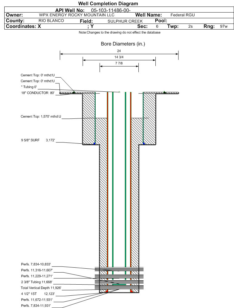 Wellbore #00 Wellbore Classification: GW Status: PR - 2/1/2023 Measured TD: 12137 ft. Vertical TD: 11926 ft.| Wellbore Data for Original Wellbore | Wellbore Classification: GW PR - 2/1/2023 | | Wellbore Permit | DIRECTIONAL | | Permit #: | | Expiration Date: | 4/28/2012 | | Proposed Top PZ Location: | Sec:6 Twp: 2S 97W | Footage: 2082 FSL 637 FWL | | Bottom Hole Location: | Sec:6 Twp: 2S 97W | Footage: 2088 FSL 624 FWL | | Proposed Depth/Form: | 12118 ft. | | Surface Mineral Owner Same: | Yes | | Mineral Owner: | FEDERAL | Surface Owner: | FEDERAL | | Unit: | Ryan Gulch Unit | Unit Number: | COC068239X | | Formation And Spacing: | Code: ILES , Formation: ILES , Order: , Unit Acreage: , Drill Unit: | | Formation And Spacing: | Code: SEGO , Formation: SEGO , Order: , Unit Acreage: , Drill Unit: | | Formation And Spacing: | Code: WMFK , Formation: WILLIAMS FORK , Order: , Unit Acreage: , Drill Unit: | | Casing: | String Type: CONDUCTOR, Hole Size: 30 in., Size: 18 in., Top: , Depth: 80 ft., Weight: 48# , Citings Type: PLANNED | | Cement: | Sacks: 220, Top: 0 ft., Bottom: 80 ft. | | Casing: | String Type: SURF, Hole Size: 14.75 in., Size: 9.625 in., Top: , Depth: 3403 ft., Weight: 36# , Citings Type: PLANNED | | Cement: | Sacks: , Top: 0 ft., Bottom: 3403 ft. | | Casing: | String Type: 1ST, Hole Size: 8.75 in., Size: 4.5 in., Top: , Depth: 12121 ft., Weight: 11.6 , Citings Type: PLANNED | | Cement: | Sacks: , Top: , Bottom: 12121 ft. | | Casing: | String Type: 3RD, Hole Size: 8.75 in., Size: 4.5 in., Top: , Depth: 12118 ft., Weight: 11.6# , Citings Type: PLANNED | | Cement: | Sacks: , Top: , Bottom: 12118 ft. |