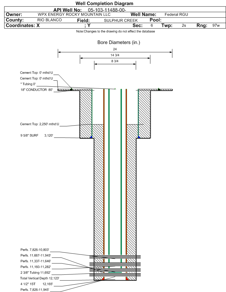 | Wellbore Completed | | Completion Date: | 10/21/2010 | | Spud Date: | 10/4/2010 | Spud Date Is: | ACTUAL | | Measured TD: | 12200 ft. | Measured PB depth: | 12077 ft. | | True Vertical TD: | 12123 ft. | True Vertical PB depth: | 12000 ft. | | Top PZ Location: | Sec:6 Twp: 2S 97W | Footage: 1853 FNL 1975 FWL | | Bottom Hole Location: | Sec:6 Twp: 2S 97W | Footage: 1854 FNL 1959 FWL | | Log Types: | PLATFORM EXPRESS; CBL AND RPM. | | Log Types: | Platform Express, CBL, Mud, and RPM | | Casing: | String Type: CONDUCTOR, Hole Size: , Size: , Top: 0 ft., Depth: 176 ft., Weight: 48 , Citings Type: ACTUAL | | Cement: | Sacks: 135, Top: 0 ft., Bottom: 176 ft., Determination Method: VISU | | Casing: | String Type: SURF, Hole Size: 14.75 in., Size: 9.625 in., Top: 0 ft., Depth: 3120 ft., Weight: 36 , Citings Type: ACTUAL | | Cement: | Sacks: 800, Top: 1150 ft., Bottom: 3120 ft., Determination Method: VISU | | Casing: | String Type: 1ST, Hole Size: 8.75 in., Size: 4.5 in., Top: 0 ft., Depth: 12165 ft., Weight: 11.6 , Citings Type: ACTUAL | | Cement: | Sacks: 1500, Top: 2250 ft., Bottom: 12165 ft., Determination Method: CBL | | Casing: | String Type: STAGE TOOL, Hole Size: , Size: 9.625 in., Top: , Depth: 1150 ft., Weight: , Citings Type: ACTUAL | | Cement: | Sacks: 768, Top: 0 ft., Bottom: 1150 ft., Determination Method: VISU | | Additional Cement: | String Type: SURF , Top: , Depth: , Bottom: , Sacks: 20, Method: Top Out | | Formation | Interval Top | Log Bottom | Cored | DSTs | | WASATCH | 5143 ft. | | | | | MESAVERDE | 7190 ft. | | | | | CAMEO | 10328 ft. | | | | | ROLLINS | 10932 ft. | | | | | COZZETTE | 11088 ft. | | | | | CORCORAN | 11308 ft. | | | | | SEGO | 11664 ft. | | | |