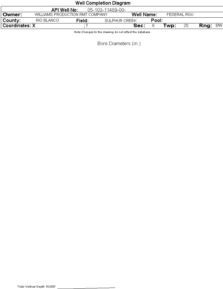 | Wellbore Completed | | Completion Date: | 12/1/2010 | | Spud Date: | 11/10/2010 | Spud Date Is: | ACTUAL | | Measured TD: | 12100 ft. | Measured PB depth: | 12039 ft. | | True Vertical TD: | 11988 ft. | True Vertical PB depth: | 11927 ft. | | Top PZ Location: | Sec:6 Twp: 2S 97W | Footage: 1264 FSL 1918 FWL | | Bottom Hole Location: | Sec:6 Twp: 2S 97W | Footage: 1265 FSL 1907 FWL | | Log Types: | CBL AND RPM | | Log Types: | RPM, MUD AND CBL | | Casing: | String Type: CONDUCTOR, Hole Size: 24 in., Size: 18 in., Top: 48 ft., Depth: 176 ft., Weight: , Citings Type: ACTUAL | | Cement: | Sacks: 66, Top: 0 ft., Bottom: 176 ft., Determination Method: CALC | | Casing: | String Type: SURF, Hole Size: 14.75 in., Size: 9.625 in., Top: 0 ft., Depth: 3154 ft., Weight: , Citings Type: ACTUAL | | Cement: | Sacks: 1780, Top: 0 ft., Bottom: 3154 ft., Determination Method: CALC | | Casing: | String Type: 1ST, Hole Size: 7.875 in., Size: 4.5 in., Top: 0 ft., Depth: 12074 ft., Weight: , Citings Type: ACTUAL | | Cement: | Sacks: 1415, Top: 2200 ft., Bottom: 12074 ft., Determination Method: CBL | | Formation | Interval Top | Log Bottom | Cored | DSTs | | MESAVERDE | 7100 ft. | | | | | CAMEO | 10231 ft. | | | | | WILLIAMS FORK - CAMEO | 10753 ft. | | | | | ROLLINS | 10821 ft. | | | | | COZZETTE | 10974 ft. | | | | | CORCORAN | 11199 ft. | | | | | SEGO | 11794 ft. | | | |