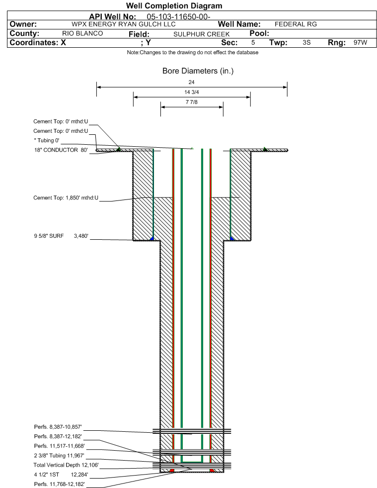 | Wellbore Completed | | Completion Date: | 12/14/2010 | | Spud Date: | 8/15/2010 | Spud Date Is: | ACTUAL | | Measured TD: | 12300 ft. | Measured PB depth: | 12106 ft. | | True Vertical TD: | 12106 ft. | True Vertical PB depth: | 11912 ft. | | Top PZ Location: | Sec:5 Twp: 3S 97W | Footage: 2144 FNL 689 FWL | | Bottom Hole Location: | Sec:5 Twp: 3S 97W | Footage: 2091 FNL 676 FWL | | Log Types: | PLATFORM EXPRESS, CBL, AND RPM | | Casing: | String Type: CONDUCTOR, Hole Size: 24 in., Size: 18 in., Top: 48 ft., Depth: 80 ft., Weight: , Citings Type: ACTUAL | | Cement: | Sacks: 135, Top: 0 ft., Bottom: 80 ft., Determination Method: VISU | | Casing: | String Type: SURF, Hole Size: 14.75 in., Size: 9.625 in., Top: 0 ft., Depth: 3480 ft., Weight: , Citings Type: ACTUAL | | Cement: | Sacks: 2735, Top: 0 ft., Bottom: 3480 ft., Determination Method: VISU | | Casing: | String Type: 1ST, Hole Size: 7.875 in., Size: 4.5 in., Top: 0 ft., Depth: 12284 ft., Weight: , Citings Type: ACTUAL | | Cement: | Sacks: 1770, Top: 1850 ft., Bottom: 12284 ft., Determination Method: CBL | | Formation | Interval Top | Log Bottom | Cored | DSTs | | MESAVERDE | 8387 ft. | | | | | CAMEO | 10651 ft. | | | | | ROLLINS | 11061 ft. | | | | | COZZETTE | 11217 ft. | | | | | CORCORAN | 11517 ft. | | | | | SEGO | 11768 ft. | | | |