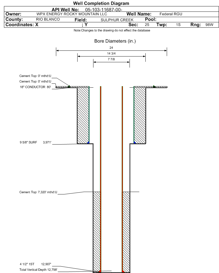 Wellbore #00 Wellbore Classification: GW Status: PR - 10/1/2014 Measured TD: 12918 ft. Vertical TD: 12798 ft.| Wellbore Data for Original Wellbore | Wellbore Classification: GW PR - 10/1/2014 | | Wellbore Permit | DIRECTIONAL | | Permit #: | | Expiration Date: | 4/22/2012 | | Proposed Top PZ Location: | Sec:25 Twp: 1S 98W | Footage: 509 FNL 650 FEL | | Bottom Hole Location: | Sec:25 Twp: 1S 98W | Footage: 509 FNL 650 FEL | | Proposed Depth/Form: | 12927 ft. | | Surface Mineral Owner Same: | Yes | | Mineral Owner: | FEDERAL | Surface Owner: | FEDERAL | | Unit: | Ryan Gulch Unit | Unit Number: | COC068239X | | Formation And Spacing: | Code: ILES , Formation: ILES , Order: 527-6 , Unit Acreage: , Drill Unit: | | Formation And Spacing: | Code: SEGO , Formation: SEGO , Order: 527-6 , Unit Acreage: , Drill Unit: | | Formation And Spacing: | Code: WMFK , Formation: WILLIAMS FORK , Order: 527-6 , Unit Acreage: , Drill Unit: | | Casing: | String Type: CONDUCTOR, Hole Size: 26 in., Size: 18 in., Top: , Depth: 80 ft., Weight: 48# , Citings Type: PLANNED | | Cement: | Sacks: 135, Top: , Bottom: 80 ft. | | Casing: | String Type: SURF, Hole Size: 14.75 in., Size: 9.625 in., Top: , Depth: 3960 ft., Weight: 36# , Citings Type: PLANNED | | Cement: | Sacks: , Top: , Bottom: 3960 ft. | | Casing: | String Type: 3RD, Hole Size: 8.75 in., Size: 4.5 in., Top: , Depth: 12927 ft., Weight: 11.6# , Citings Type: PLANNED | | Cement: | Sacks: , Top: , Bottom: 12927 ft. |