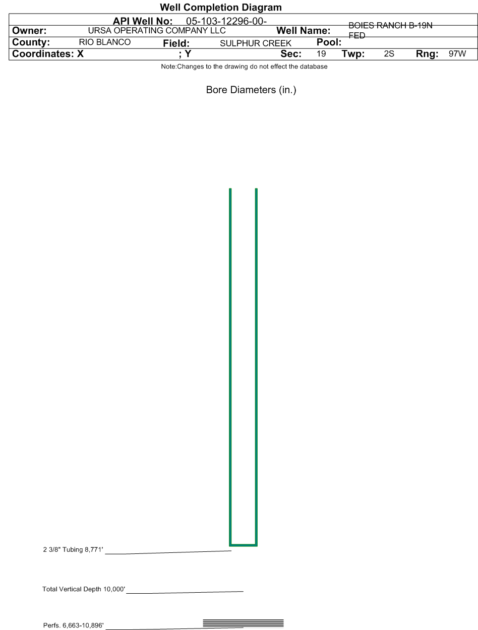 | Wellbore Completed | | Completion Date: | 10/31/2018 | | Spud Date: | 9/5/2018 | Spud Date Is: | ACTUAL | | Measured TD: | 11028 ft. | Measured PB depth: | 10993 ft. | | True Vertical TD: | 10891 ft. | True Vertical PB depth: | 10856 ft. | | Top PZ Location: | Sec:19 Twp: 2S 97W | Footage: 2278 FSL 1821 FWL | | Bottom Hole Location: | Sec:19 Twp: 2S 97W | Footage: 2260 FSL 1820 FWL | | Log Types: | CBL, MUD, PULSED NEUTRON (TRIPLE COMBO IN API 103-12301) | | Casing: | String Type: CONDUCTOR, Hole Size: 24 in., Size: 18 in., Top: 0 ft., Depth: 81 ft., Weight: 87.5 , Citings Type: ACTUAL | | Cement: | Sacks: 75, Top: 0 ft., Bottom: 81 ft., Determination Method: VISU | | Casing: | String Type: SURF, Hole Size: 13.5 in., Size: 9.625 in., Top: 0 ft., Depth: 3584 ft., Weight: 36 , Citings Type: ACTUAL | | Cement: | Sacks: 1163, Top: 0 ft., Bottom: 3605 ft., Determination Method: VISU | | Casing: | String Type: 1ST, Hole Size: 7.875 in., Size: 4.5 in., Top: 0 ft., Depth: 11006 ft., Weight: 13.5 , Citings Type: ACTUAL | | Cement: | Sacks: 1050, Top: 3970 ft., Bottom: 11028 ft., Determination Method: CBL | | Formation | Interval Top | Log Bottom | Cored | DSTs | | OHIO CREEK | 6050 ft. | | N | N | | WILLIAMS FORK | 6050 ft. | | N | N | | CAMEO | 9413 ft. | | N | N | | ROLLINS | 9970 ft. | | N | N | | COZZETTE | 10117 ft. | | N | N | | CORCORAN | 10341 ft. | | N | N | | SEGO | 10613 ft. | | N | N |