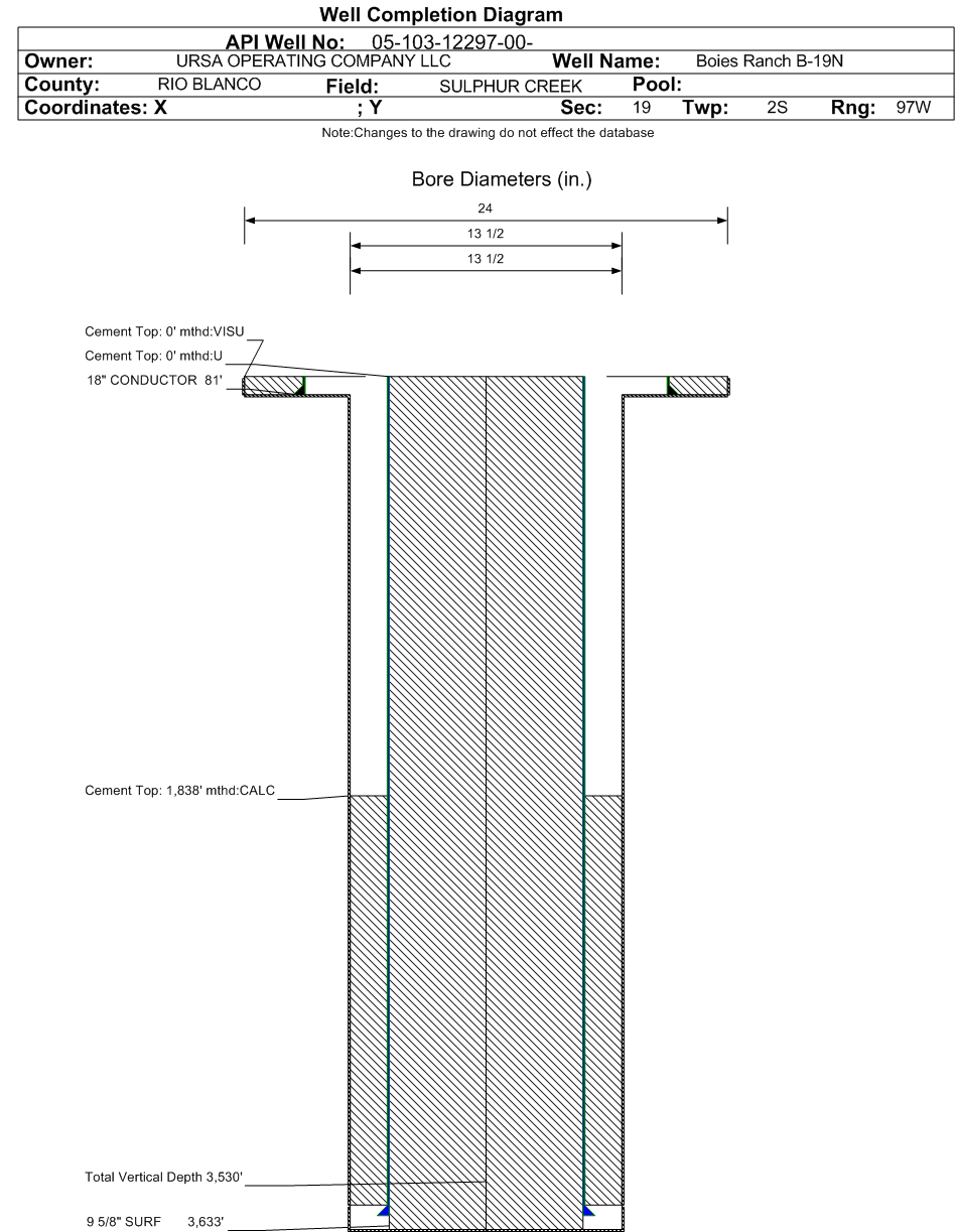 | Wellbore Completed | | Completion Date: | 9/1/2018 | | Spud Date: | 8/28/2018 | Spud Date Is: | ACTUAL | | Measured TD: | 3740 ft. | Measured PB depth: | 2581 ft. | | True Vertical TD: | 3530 ft. | True Vertical PB depth: | 2371 ft. | | Bottom Hole Location: | Sec:19 Twp: 2S 97W | Footage: 1855 FSL 2498 FWL | | Log Types: | | | Casing: | String Type: CONDUCTOR, Hole Size: 24 in., Size: 18 in., Top: 0 ft., Depth: 81 ft., Weight: 87.5 , Citings Type: ACTUAL | | Cement: | Sacks: 75, Top: 0 ft., Bottom: 81 ft., Determination Method: VISU | | Casing: | String Type: SURF, Hole Size: 13.5 in., Size: 9.625 in., Top: 0 ft., Depth: 3633 ft., Weight: 36 , Citings Type: ACTUAL | | Cement: | Sacks: 545, Top: 1838 ft., Bottom: 3633 ft., Determination Method: CALC | | Casing: | String Type: OPEN HOLE, Hole Size: 13.5 in., Size: , Top: 3633 ft., Depth: 3740 ft., Weight: , Citings Type: ACTUAL | | Cement: | Sacks: , Top: , Bottom: , Determination Method: | | Additional Cement: | String Type: SURF , Top: 3381 ft., Depth: 3633 ft., Bottom: 3633 ft., Sacks: 95, Method: | | Additional Cement: | String Type: SURF , Top: 0 ft., Depth: 2031 ft., Bottom: 631 ft., Sacks: 631, Method: STAGE TOOL | | Formation | Interval Top | Log Bottom | Cored | DSTs | | GREEN RIVER | 981 ft. | | N | N | | GARDEN GULCH | 2222 ft. | | N | N | | WILLIAMS FORK | 2567 ft. | | N | N | | No formation data to display. |