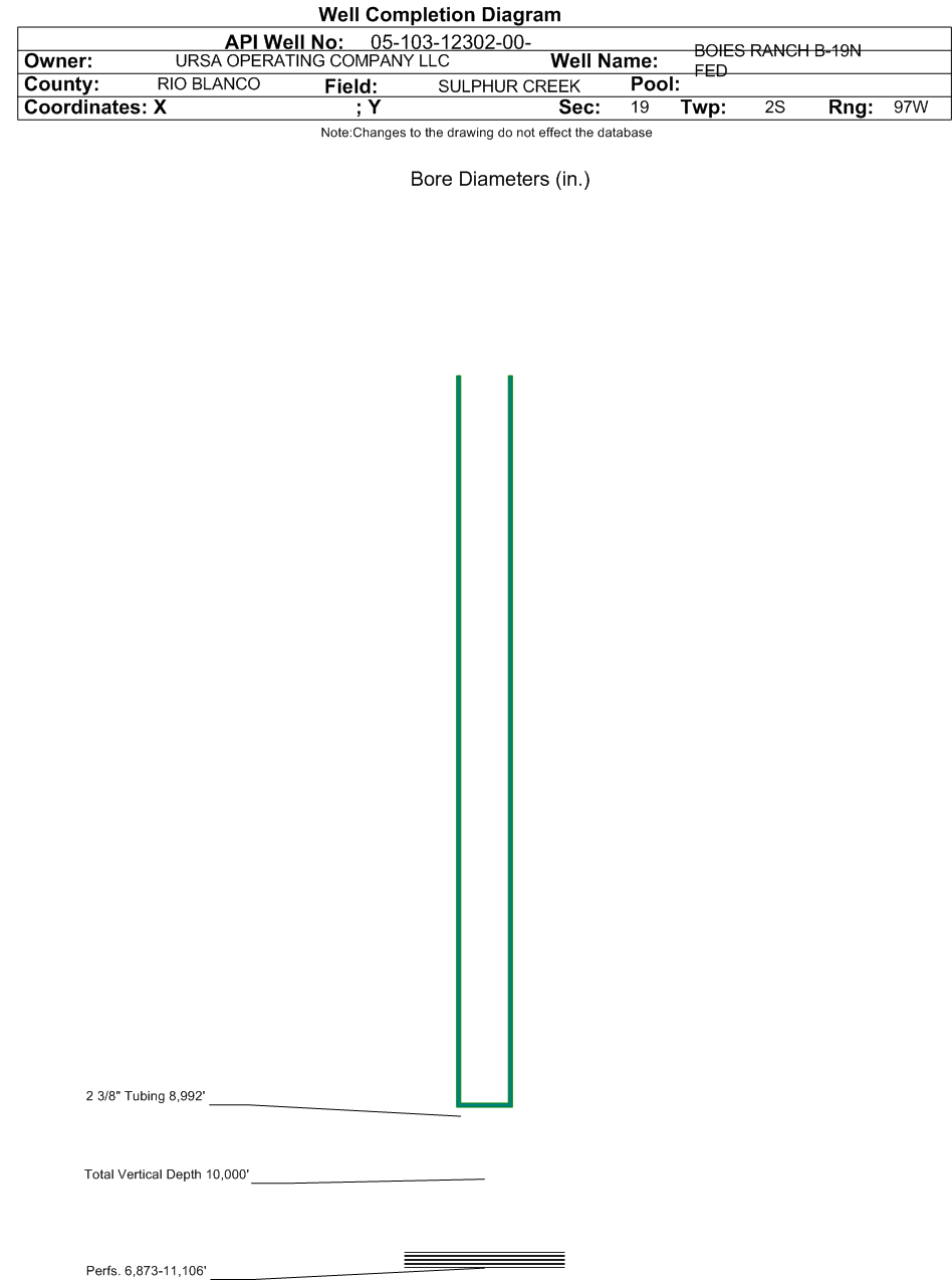 | Wellbore Completed | | Completion Date: | 10/17/2018 | | Spud Date: | 9/11/2018 | Spud Date Is: | ACTUAL | | Measured TD: | 11320 ft. | Measured PB depth: | 11280 ft. | | True Vertical TD: | 10999 ft. | True Vertical PB depth: | 10959 ft. | | Top PZ Location: | Sec:19 Twp: 2S 97W | Footage: 2129 FSL 2164 FEL | | Bottom Hole Location: | Sec:19 Twp: 2S 97W | Footage: 2103 FSL 2229 FEL | | Log Types: | CBL, MUD, PULSED NEUTRON, (TRIPLE COMBO IN API 103-12301) | | Casing: | String Type: CONDUCTOR, Hole Size: 24 in., Size: 18 in., Top: 0 ft., Depth: 81 ft., Weight: 87.5 , Citings Type: ACTUAL | | Cement: | Sacks: 75, Top: 0 ft., Bottom: 81 ft., Determination Method: VISU | | Casing: | String Type: SURF, Hole Size: 13.5 in., Size: 9.625 in., Top: 0 ft., Depth: 3643 ft., Weight: 36 , Citings Type: ACTUAL | | Cement: | Sacks: 1185, Top: 0 ft., Bottom: 3660 ft., Determination Method: VISU | | Casing: | String Type: 1ST, Hole Size: 7.875 in., Size: 4.5 in., Top: 0 ft., Depth: 11302 ft., Weight: 13.5 , Citings Type: ACTUAL | | Cement: | Sacks: 1076, Top: 5320 ft., Bottom: 11320 ft., Determination Method: CBL | | Formation | Interval Top | Log Bottom | Cored | DSTs | | WASATCH G | 4483 ft. | | N | N | | FORT UNION | 4915 ft. | | N | N | | OHIO CREEK | 6312 ft. | | N | N | | WILLIAMS FORK | 6312 ft. | | N | N | | CAMEO | 9731 ft. | | N | N | | ROLLINS | 10251 ft. | | N | N | | COZZETTE | 10391 ft. | | N | N | | CORCORAN | 10620 ft. | | N | N | | SEGO | 10901 ft. | | N | N |