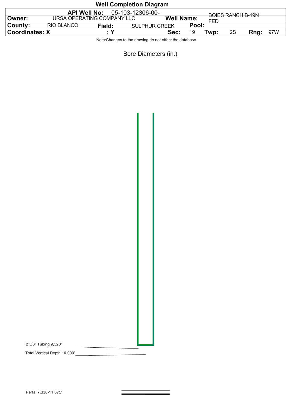 | Wellbore Completed | | Completion Date: | 10/24/2018 | | Spud Date: | 9/8/2018 | Spud Date Is: | ACTUAL | | Measured TD: | 11810 ft. | Measured PB depth: | 11746 ft. | | True Vertical TD: | 11129 ft. | True Vertical PB depth: | 11065 ft. | | Top PZ Location: | Sec:19 Twp: 2S 97W | Footage: 1960 FSL 874 FEL | | Bottom Hole Location: | Sec:19 Twp: 2S 97W | Footage: 1970 FSL 887 FEL | | Log Types: | CBL, MUD, PULSED NEUTRON (TRIPLE COMBO IN API 103-12301) | | Casing: | String Type: CONDUCTOR, Hole Size: 24 in., Size: 18 in., Top: 0 ft., Depth: 81 ft., Weight: 87.5 , Citings Type: ACTUAL | | Cement: | Sacks: 75, Top: 0 ft., Bottom: 81 ft., Determination Method: VISU | | Casing: | String Type: SURF, Hole Size: 13.5 in., Size: 9.625 in., Top: 0 ft., Depth: 3799 ft., Weight: 36 , Citings Type: ACTUAL | | Cement: | Sacks: 1213, Top: 0 ft., Bottom: 3820 ft., Determination Method: VISU | | Casing: | String Type: 1ST, Hole Size: 7.875 in., Size: 4.5 in., Top: 0 ft., Depth: 11793 ft., Weight: 13.5 , Citings Type: ACTUAL | | Cement: | Sacks: 1124, Top: 5340 ft., Bottom: 11810 ft., Determination Method: CBL | | Formation | Interval Top | Log Bottom | Cored | DSTs | | OHIO CREEK | 6698 ft. | | N | N | | WILLIAMS FORK | 6698 ft. | | N | N | | ROLLINS | 10683 ft. | | N | N | | COZZETTE | 10822 ft. | | N | N | | CORCORAN | 11045 ft. | | N | N | | SEGO | 11324 ft. | | N | N |