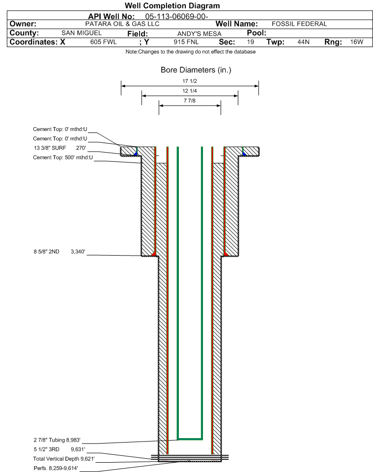 | Wellbore Completed | | Completion Date: | 11/4/1999 | | Spud Date: | 8/10/1999 | Spud Date Is: | ACTUAL | | Measured TD: | 9635 ft. | Measured PB depth: | | | True Vertical TD: | 9621 ft. | True Vertical PB depth: | | | Bottom Hole Location: | Sec: Twp: | Footage: 865 FNL 820 FWL | | Log Types: | LTL,CNL-CD,ML,SONIC,CMR,FMI,RFT,VSP,CBL-CET,CCL-GR | | Casing: | String Type: SURF, Hole Size: 17.5 in., Size: 13.375 in., Top: , Depth: 270 ft., Weight: 68 , Citings Type: ACTUAL | | Cement: | Sacks: 565, Top: , Bottom: 270 ft., Determination Method: CALC | | Casing: | String Type: 2ND, Hole Size: 12.25 in., Size: 8.625 in., Top: , Depth: 3340 ft., Weight: 32 , Citings Type: ACTUAL | | Cement: | Sacks: 3375, Top: , Bottom: 3375 ft., Determination Method: CALC | | Casing: | String Type: 3RD, Hole Size: 7.875 in., Size: 5.5 in., Top: , Depth: 9631 ft., Weight: 17 , Citings Type: ACTUAL | | Cement: | Sacks: 1937, Top: 500 ft., Bottom: 9631 ft., Determination Method: CBL | | Formation | Interval Top | Log Bottom | Cored | DSTs | | MORRISON | 240 ft. | 940 ft. | N | N | | ENTRADA | 940 ft. | 1170 ft. | N | N | | NAVAJO | 1170 ft. | 1846 ft. | N | N | | CHINLE | 2355 ft. | 2754 ft. | N | N | | SHINARUMP | 2754 ft. | 2830 ft. | N | N | | MOENKOPI | 2830 ft. | 3314 ft. | N | N | | CUTLER | 3314 ft. | 7126 ft. | Y | N | | HONAKER TRAIL | 7126 ft. | 8762 ft. | Y | N | | ISMAY | 9446 ft. | 9593 ft. | Y | N |