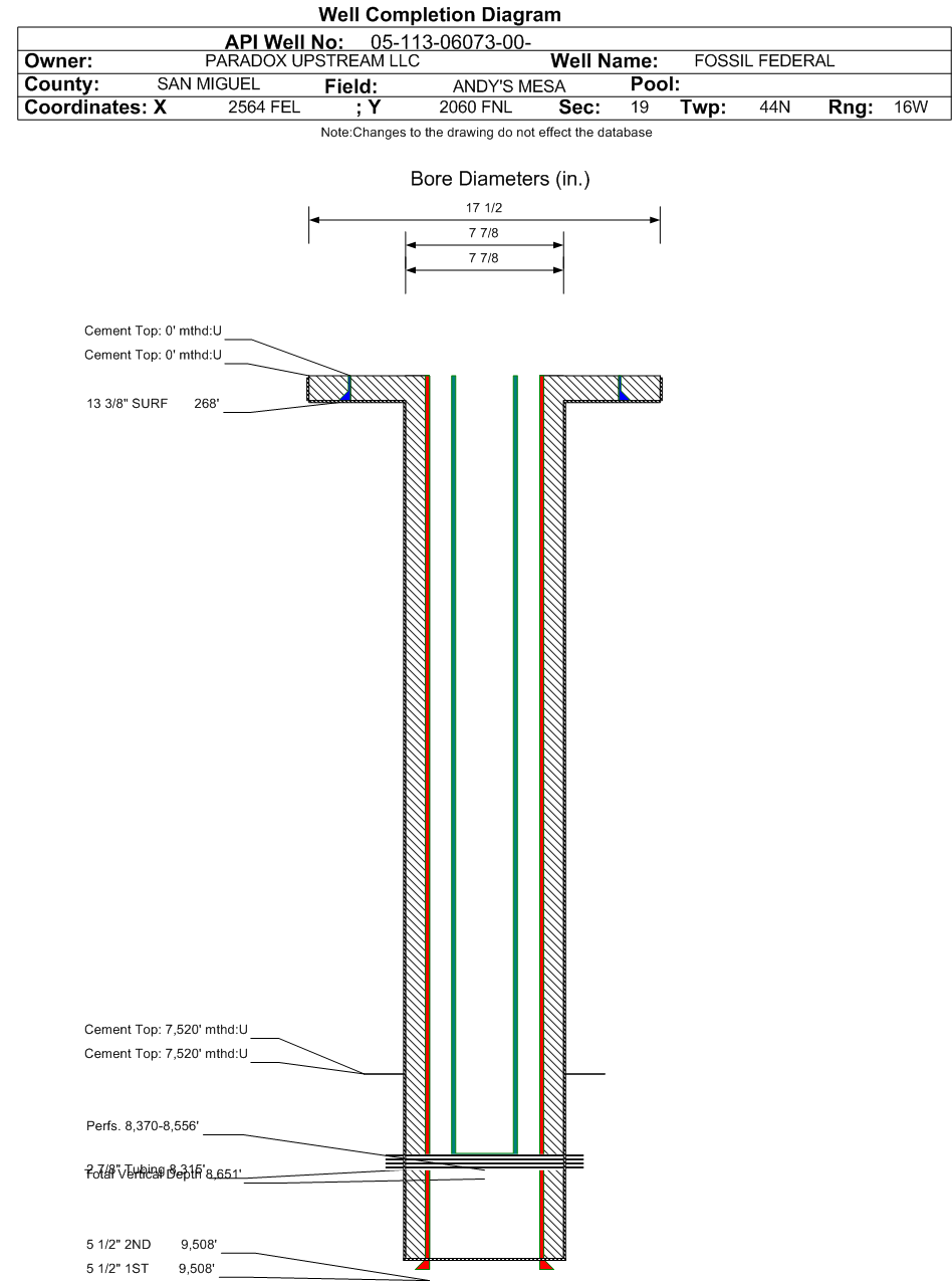 Wellbore #00 Wellbore Classification: GW Status: SI - 1/1/2025 Measured TD: 9525 ft. Vertical TD: 8651 ft.| Wellbore Data for Original Wellbore | Wellbore Classification: GW SI - 1/1/2025 | | Wellbore Permit | | | Permit #: | 010930 | Expiration Date: | 5/10/2002 | | Proposed Top PZ Location: | Sec: Twp: | Footage: 1826 FNL 2261 FEL | | Bottom Hole Location: | Sec:19 Twp: 44N 16W | Footage: 1826 FNL 2261 FEL | | Proposed Depth/Form: | 9807 ft. | | Surface Mineral Owner Same: | Yes | | Mineral Owner: | FEDERAL | Surface Owner: | FEDERAL | | Unit: | DOUBLE EAGLE | Unit Number: | | | Formation And Spacing: | Code: CTLR , Formation: CUTLER , Order: , Unit Acreage: 320, Drill Unit: E/2 | | Formation And Spacing: | Code: HNKRT , Formation: HONAKER TRAIL , Order: , Unit Acreage: 320, Drill Unit: E/2 | | Casing: | String Type: 1ST LINER, Hole Size: 7.875 in., Size: 5.5 in., Top: , Depth: 9087 ft., Weight: 17 , Citings Type: PLANNED | | Cement: | Sacks: 1119, Top: 2700 ft., Bottom: 9087 ft. | | Casing: | String Type: STAGE TOOL, Hole Size: , Size: , Top: , Depth: 7300 ft., Weight: , Citings Type: PLANNED | | Cement: | Sacks: , Top: , Bottom: |