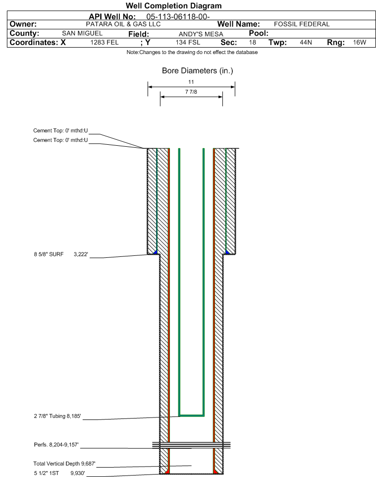 Wellbore #00 Wellbore Classification: GW Status: SI - 10/1/2021 Measured TD: 9950 ft. Vertical TD: 9687 ft.| Wellbore Data for Original Wellbore | Wellbore Classification: GW SI - 10/1/2021 | | Wellbore Permit | | | Permit #: | 20030120 | Expiration Date: | 2/4/2004 | | Proposed Top PZ Location: | Sec: Twp: | Footage: 1399 FNL 2167 FEL | | Bottom Hole Location: | Sec:19 Twp: 44n 16w | Footage: 1449 FNL 2153 FEL | | Proposed Depth/Form: | 10225 ft. | | Surface Mineral Owner Same: | Yes | | Mineral Owner: | FEDERAL | Surface Owner: | FEDERAL | | Unit: | DOULBE EAGLE UN | Unit Number: | | | Formation And Spacing: | Code: CT-HT , Formation: CUTLER-HONAKER TRAIL , Order: , Unit Acreage: 160, Drill Unit: SE/4 | | Formation And Spacing: | Code: LASAL , Formation: LASAL , Order: , Unit Acreage: , Drill Unit: |
