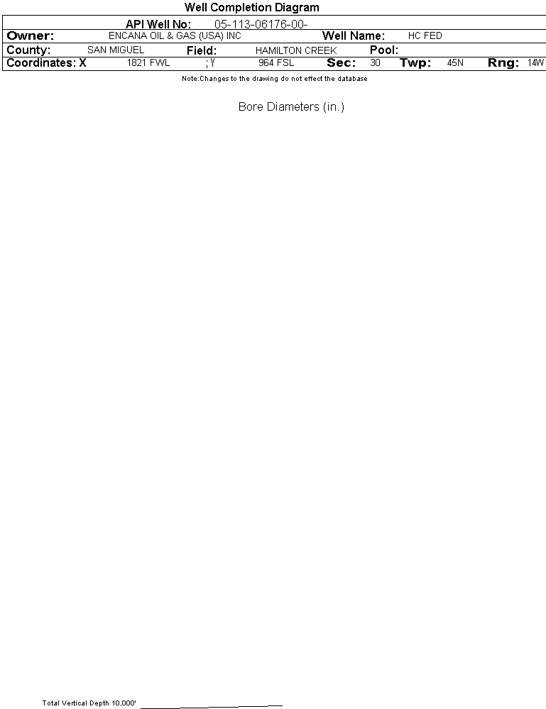 Wellbore #00 Wellbore Classification: Status: AL - 3/3/2005 Measured TD: | Wellbore Data for Original Wellbore | Wellbore Classification: AL - 3/3/2005 | | Wellbore Permit | DIRECTIONAL | | Permit #: | 20050723 | Expiration Date: | 3/28/2006 | | Proposed Top PZ Location: | Sec: Twp: | Footage: 660 FSL 1980 FEL | | Bottom Hole Location: | Sec: Twp: | Footage: 660 FSL 1980 FEL | | Proposed Depth/Form: | 9850 ft. | | Surface Mineral Owner Same: | Yes | | Mineral Owner: | FEDERAL | Surface Owner: | FEDERAL | | Unit: | HAMILTON UNIT | Unit Number: | COC 047632X | | Formation And Spacing: | Code: CTLR , Formation: CUTLER , Order: , Unit Acreage: , Drill Unit: | | Formation And Spacing: | Code: HRMS , Formation: HERMOSA , Order: , Unit Acreage: , Drill Unit: | | Casing: | String Type: CONDUCTOR, Hole Size: 24 in., Size: 16 in., Top: , Depth: 60 ft., Weight: 55 , Citings Type: PLANNED | | Cement: | Sacks: 60, Top: 0 ft., Bottom: 60 ft. | | Casing: | String Type: SURF, Hole Size: 12.25 in., Size: 9.625 in., Top: , Depth: 1810 ft., Weight: 36 , Citings Type: PLANNED | | Cement: | Sacks: 580, Top: 0 ft., Bottom: 1810 ft. | | Casing: | String Type: 1ST, Hole Size: 8.75 in., Size: 5.5 in., Top: , Depth: 9850 ft., Weight: 17 , Citings Type: PLANNED | | Cement: | Sacks: 1660, Top: 3200 ft., Bottom: 9850 ft. |