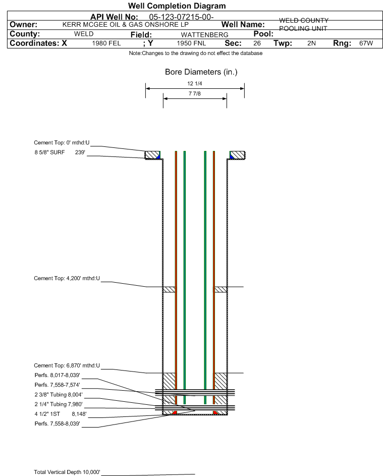 | Wellbore Completed | | Completion Date: | 10/23/1996 | | Spud Date: | 12/17/1970 | Spud Date Is: | ACTUAL | | Measured TD: | 8148 ft. | Measured PB depth: | 8092 ft. | | True Vertical TD: | | True Vertical PB depth: | | | Log Types: | DENSITY, COMP. NEUTRON, CORR CBL | | Log Types: | IES, GR, COMPENSATED DENSITY, COMPENSATED NEUTRON, CORRELATION | | Casing: | String Type: SURF, Hole Size: 12.25 in., Size: 8.625 in., Top: , Depth: 239 ft., Weight: 24 , Citings Type: ACTUAL | | Cement: | Sacks: 200, Top: 0 ft., Bottom: 239 ft., Determination Method: VISU | | Casing: | String Type: 1ST, Hole Size: 7.875 in., Size: 4.5 in., Top: , Depth: 8148 ft., Weight: 11.6 , Citings Type: ACTUAL | | Cement: | Sacks: 350, Top: 6870 ft., Bottom: 8148 ft., Determination Method: CBL | | Casing: | String Type: S.C. 1.1, Hole Size: , Size: , Top: , Depth: 8148 ft., Weight: , Citings Type: ACTUAL | | Cement: | Sacks: 350, Top: 4200 ft., Bottom: 4370 ft., Determination Method: CBL | | Casing: | String Type: S.C. 2.1, Hole Size: , Size: , Top: , Depth: 8148 ft., Weight: , Citings Type: ACTUAL | | Cement: | Sacks: 350, Top: 4910 ft., Bottom: 5090 ft., Determination Method: CBL | | Casing: | String Type: S.C. 3.1, Hole Size: , Size: , Top: , Depth: 8148 ft., Weight: , Citings Type: ACTUAL | | Cement: | Sacks: 150, Top: 6870 ft., Bottom: 7361 ft., Determination Method: CBL | | Casing: | String Type: STAGE TOOL, Hole Size: , Size: , Top: , Depth: 657 ft., Weight: , Citings Type: ACTUAL | | Cement: | Sacks: 250, Top: 0 ft., Bottom: 657 ft., Determination Method: CBL | | Formation | Interval Top | Log Bottom | Cored | DSTs | | FOX HILLS BASE | 592 ft. | | N | N | | SUSSEX | 4500 ft. | | N | N | | SHANNON | 5060 ft. | | N | N | | NIOBRARA | 7265 ft. | | N | N | | CODELL | 7558 ft. | | N | N | | J SAND | 7978 ft. | | N | N | | MUDDY J | 8017 ft. | | N | N |
